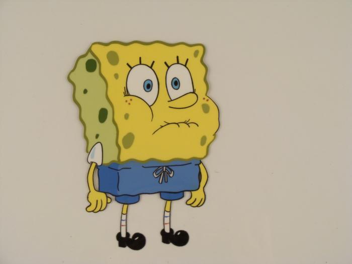 This original animation cel is from the Nickelodeon TV show SpongeBob Squarepants. The story takes place under the deep blue sea in Bikini Bottom, where SpongeBob resides. SpongeBob, who is a yellow, porous sponge, is your typical happy-go-lucky character, as he is always cheerful and enjoys making people laugh. Patrick Star, SpongeBob's neighbor who is a starfish, is your average children's show idiot, as he boasts knowing nothing and is often getting himself into ridiculous situations. Between the homes of these two lies the home of the miserable Squidward, a squid, who is known for being grouchy and playing tricks on SpongeBob and Patrick. Both SpongeBob and Squidward work at the Krusty Krab, a fast food business run by the greedy money-loving Mr. Krabs, a crab, the arch rival of the evil, possibly misunderstood, Plankton. Another neighbor, Sandy Cheeks, an athletic squirrel who normally wears an astronaut's space suit, was introduced in "Tea at the Treedome." She spends most of her time inventing and experimenting. IMoment of silence, please...Original Production Animated Cel Overall Size of Cel: 10 1/2" x 12 1/2" Excellent ConditionThis is an original hand-painted cel set-up used in the production of an episode of "SpongeBob SquarePants." Each one-of-a-kind set-up represents a slight change in position of the characters. When individually photographed and projected in rapid succession, the images appear to move.