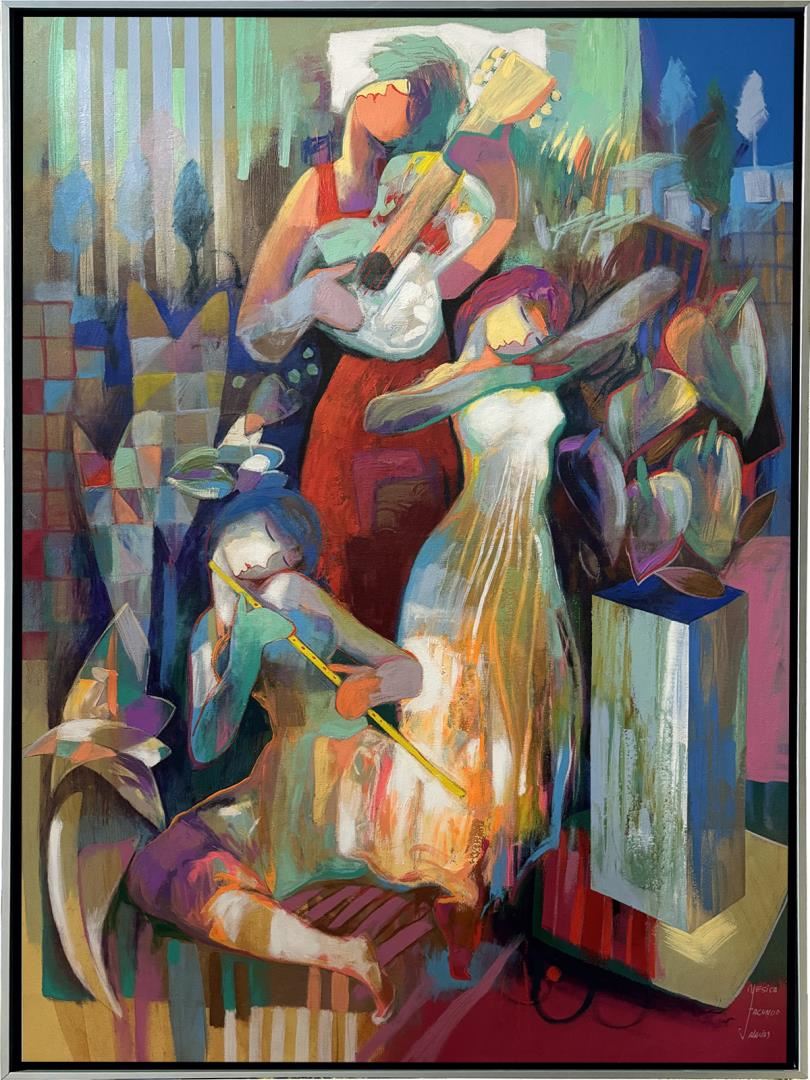 This exquisite original 45x60" acrylic artwork on canvas exemplifies the artist's mastery and creative vision. This hand signed piece comes framed ensuring a sophisticated presentation that is ready to hang.