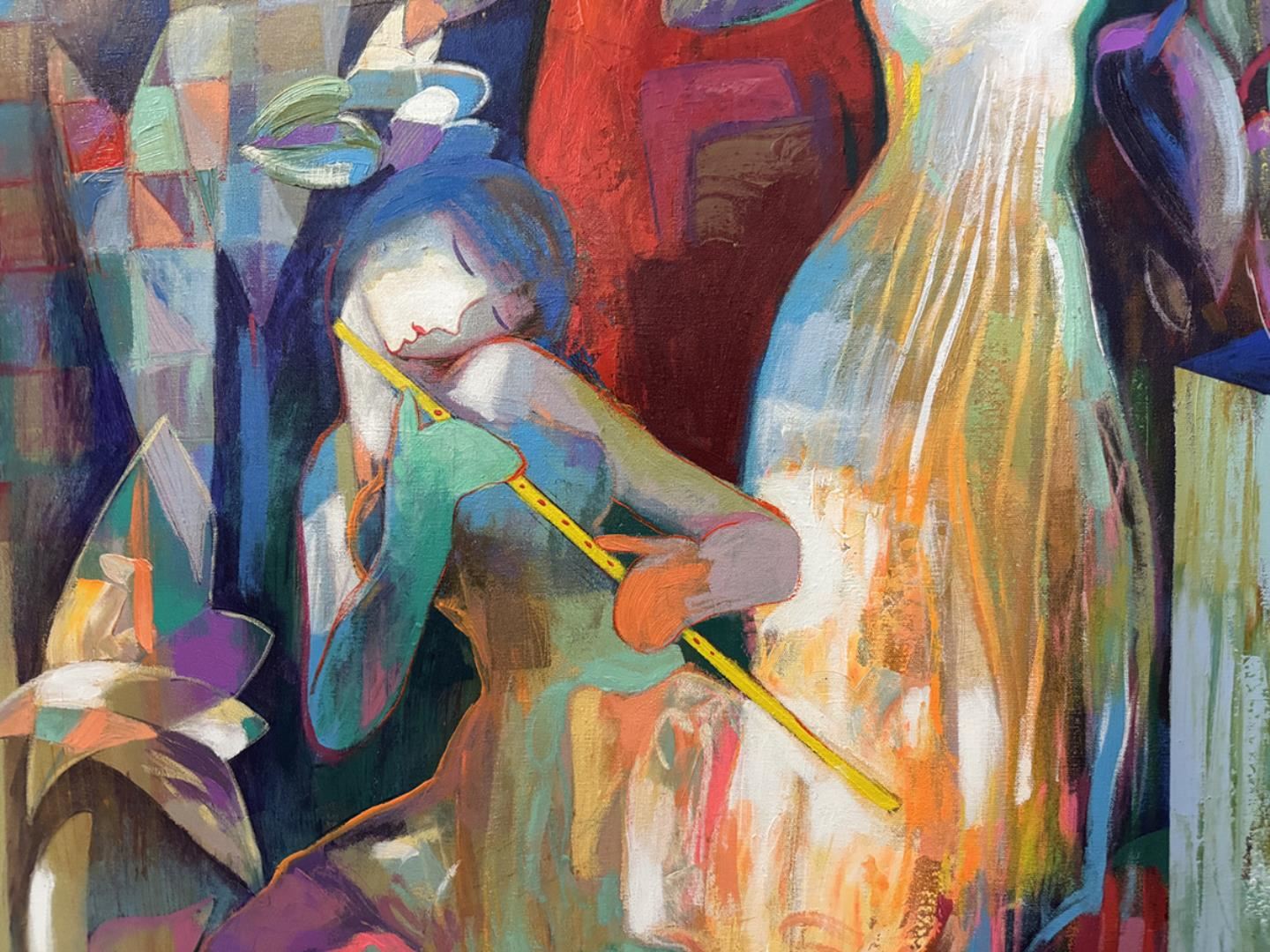 This exquisite original acrylic artwork on 45x60" canvas exemplifies the artist's mastery and creative vision. This hand signed piece comes framed ready to hang.