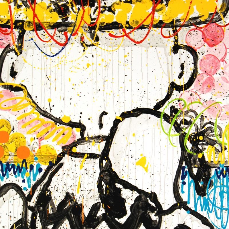 Master Artist Tom Everhart is the protege of famed "Peanuts" creator, Charles M. Schulz (1922-2000). As the only artist in the world granted the rights to draw the "Peanuts" characters in his own work, Everhart creates vibrant, extremely collectible rainbow masterpieces featuring Snoopy, Woodstock and the gang. "Mon Ami" is a limited edition hand pulled original lithograph on museum quality deckle-edge paper, numbered and hand signed by Everhart! Includes certificate of authenticity! Measures approx. 25" x 36" (with border); 21" x 30.5" (image). This artwork was created on one of two rare antique Marinoni Voirin lithograph presses that date back to the 1800's, and are reputed to come from the Paris print shop used by Henri Toulouse-Lautrec. There are only 7 of these magnificent beasts left in the world: the smaller one (with a print bed size of 25" x 35"), weighs 9 tons, and the larger one weighs in at 11 tons (print bed size 31" x 47"). The significance of this is that the lithographs produced by this method are of the finest quality, using techniques that are so labor and time intensive that very few master printers know how to operate and care for these presses today. Each lithograph is created with hand-mixed colors applied one at a time - a highly trained and synchronized team must hand feed each museum-quality sheet of paper through the press numerous times in order to set the colors and impressions, while the Chromist - a trained color specialist - adjusts each color by look and feel to match the original artwork, as if mixing a potion. The result is an image with maximum pigment saturation, formed through rich layers of color that imbue the artwork with a permanency of brilliance - proven over centuries to last. In contrast, today's printers use a method more akin to a dot matrix style application, with the colors all premixed and sprayed onto a sheet in a uniform layer, resulting in a much less saturated image that is susceptible to fading and imperfect color reproduction. This is one of the final Tom Everhart editions to be printed using this very special technique.