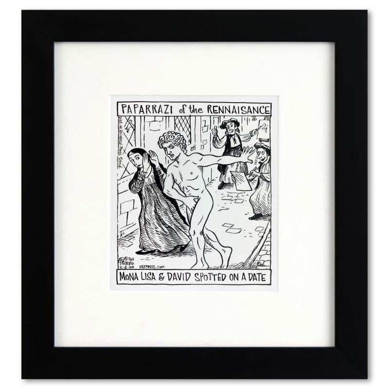 Enter a surreal and satirical world of twisted imagination and award winning creativity. "Mona Lisa and David Paparrazi" is an original pen & ink drawing on paper by Dan Piraro, creator of the critically acclaimed and award winning comic strip, Bizarro. This piece is hand signed, comes custom framed and includes a letter of authenticity. Measures approximately 12" x 11" (frame), 7" x 6" (image). This item requires special handling and may have a longer than usual turnaround.