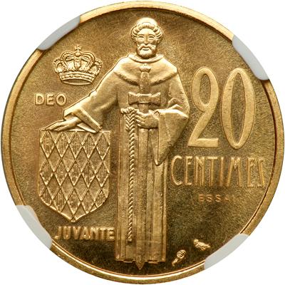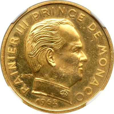 Monaco. Essai Gold Set: 50, 20 and 10 Centimes in Gold, 1962. KM-E51, E48, E45. 0.9200 fine gold. Mintage of 502 sets. Prince Rainier III. Head right. Reverse: Figure with hand on shield divides crown and value. In a new 4 prong NGC holder. Lot of 3 coins. NGC graded 50 Centimes, MS-62; 20 and 10 Centimes NGC graded MS-64.