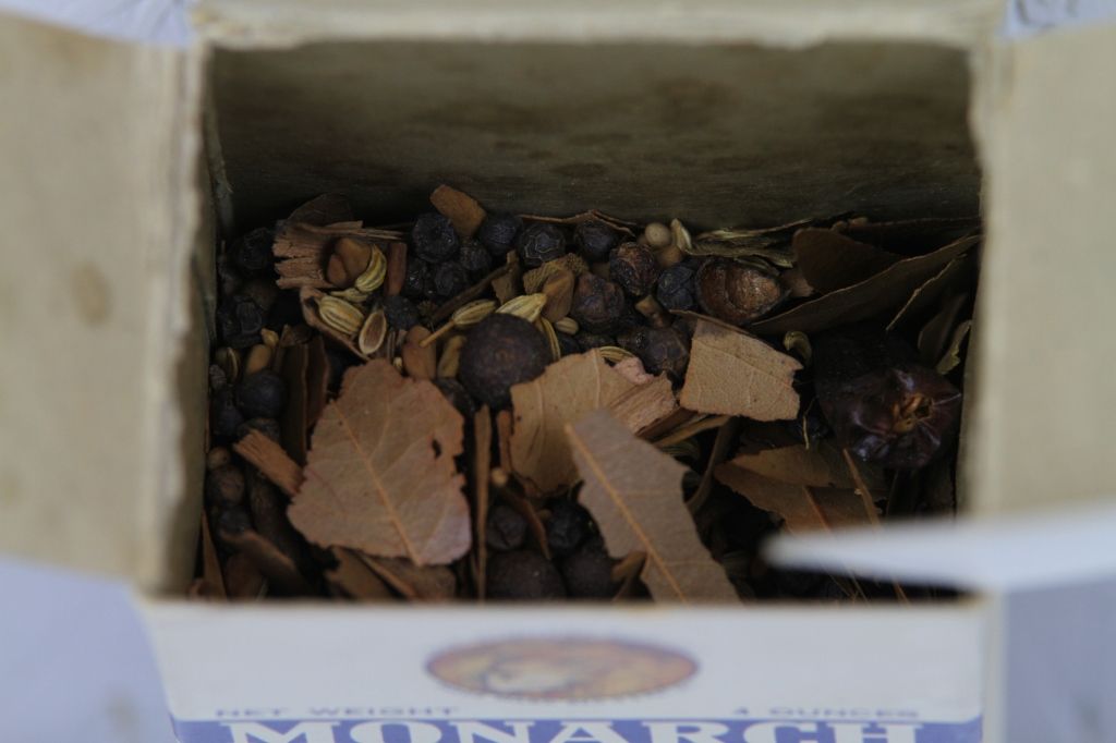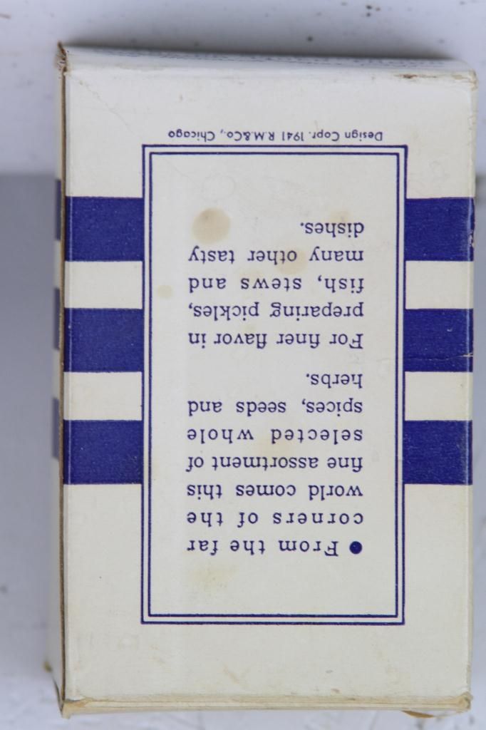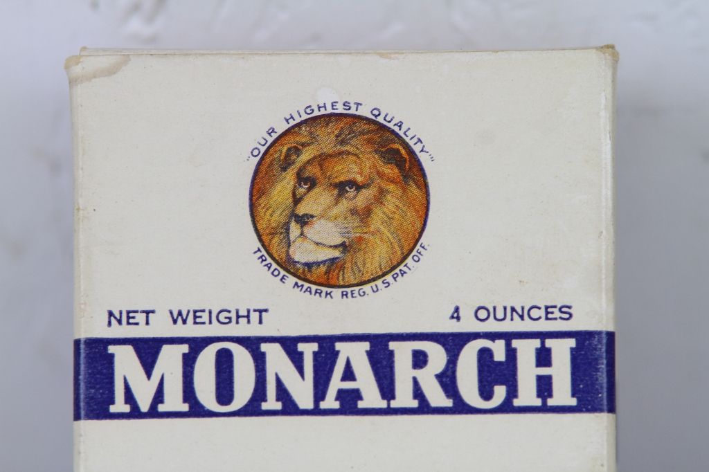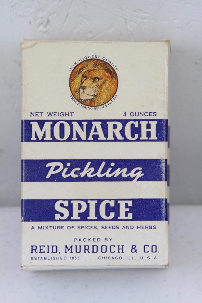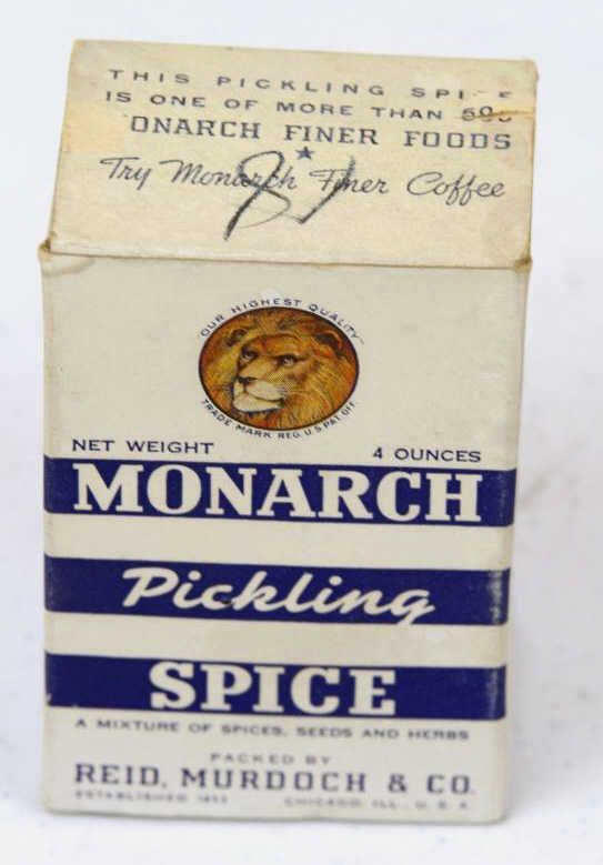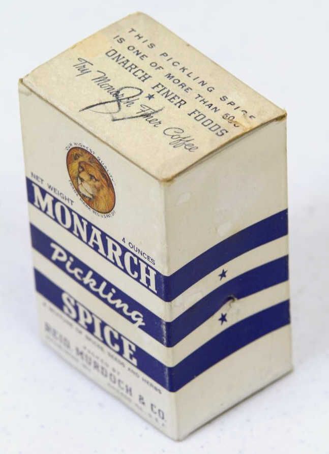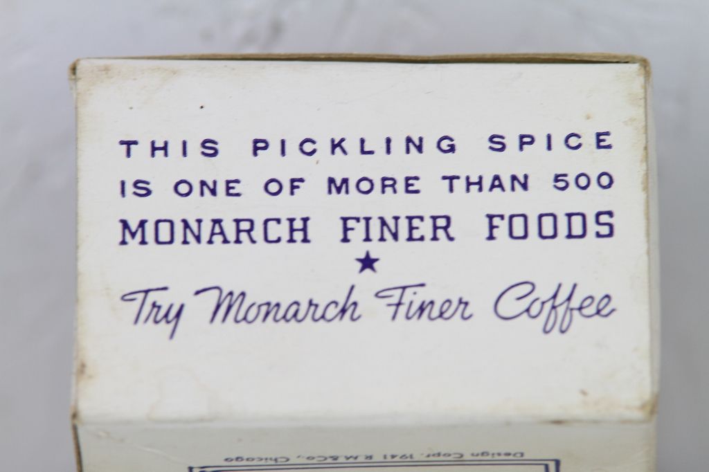 Monarch Pickling Spice Paper Label Box This has the original Spice still inside it. This is a more Rare piece, as it is made of paper. Measures 4" tall.