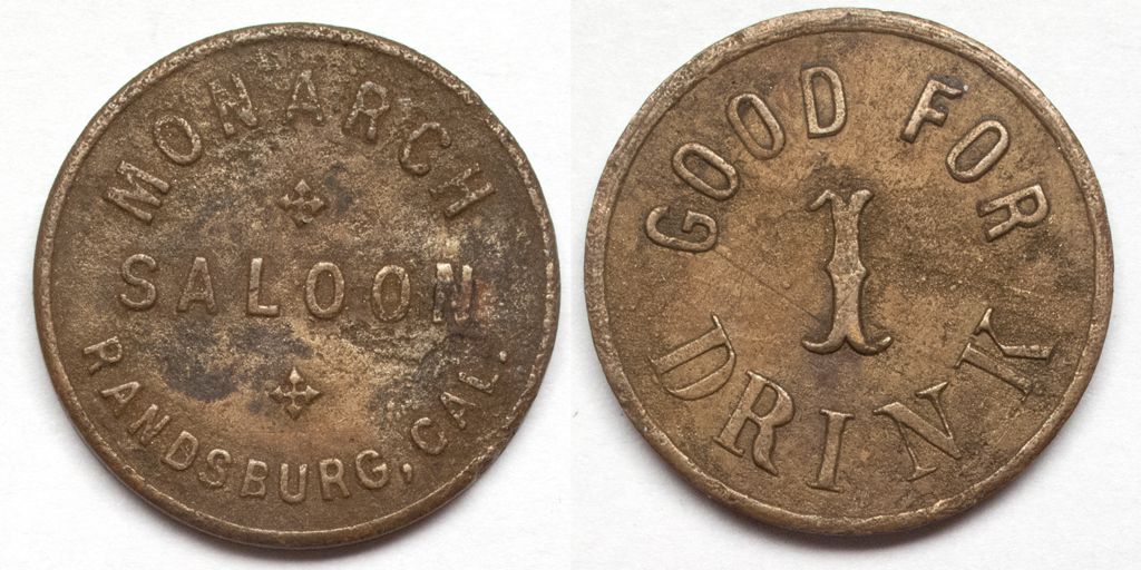 Nice example of this token. Monarch Saloon / Randsburg, Cal // GF 1 drink. City: RandsburgCounty: KernState: CADate: