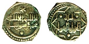 Anónima incierta. ¿Taifa de Badajoz?. Moneda de electrón sin ceca, de escritura confusa, atribuida a los Banu Alaftas de Badajoz. 0,7gr. V-no catalogada. MBC.