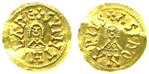 Suinthila (621-631). Tremissis. Asidona (Medina Sidonia). Anv.: +SVINTHILA REX. Rev.: +ASIDONA PIVS. Ligeramente alabeada. Rarísima. 1,52gr. CNV-283. Au. MBC+.
