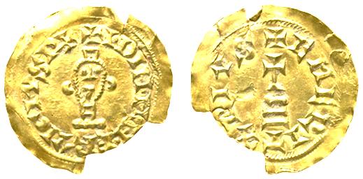 Ervigius (680-687). Tremissis. Emerita (Mérida). Anv.:+I.D.I.N.H.N. ERVIGIVS.P+ Rev.: +EMERITA PIVS. Cospel faltado. 1,41gr. CNV-502.7. Au. EBC.