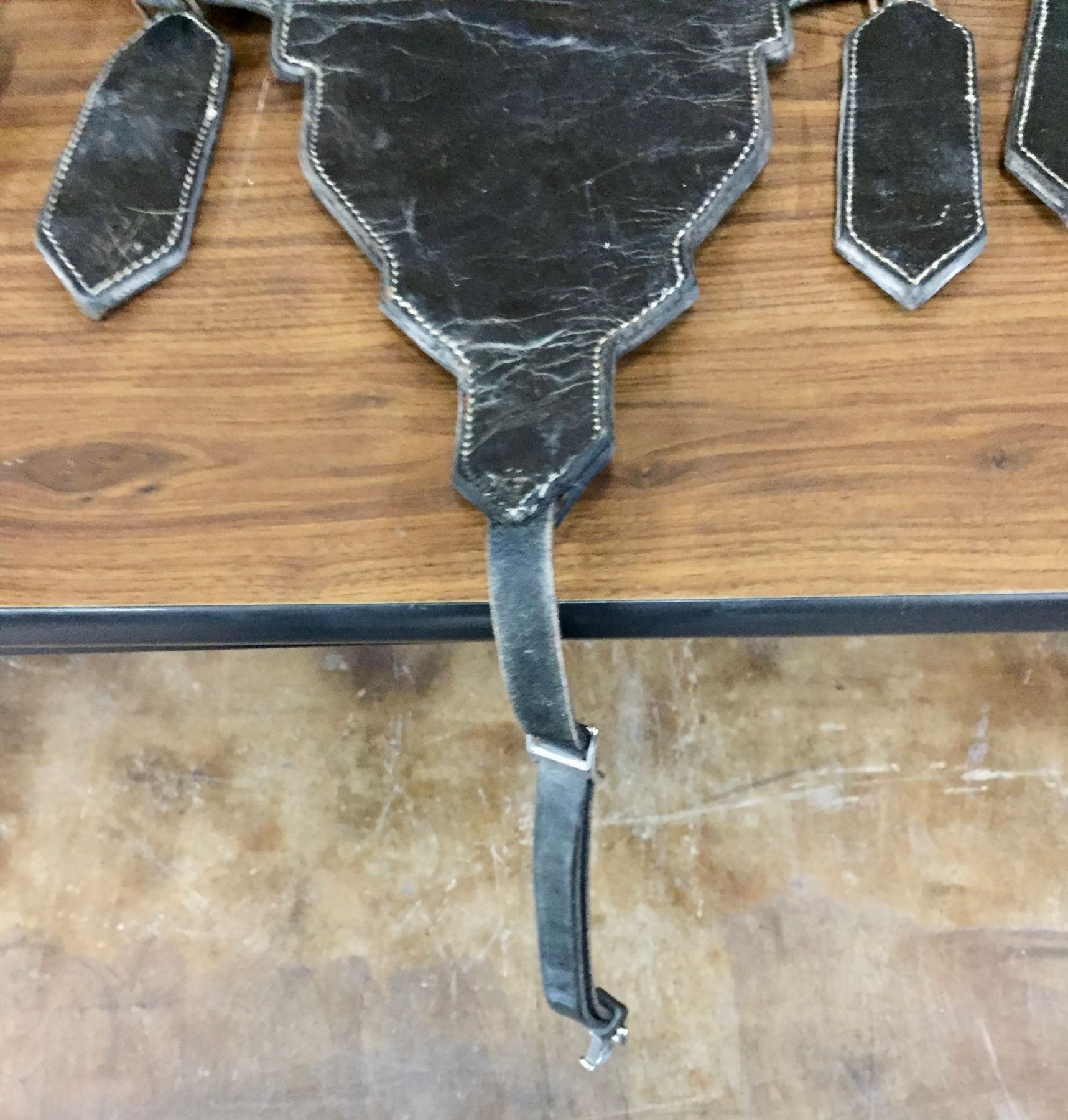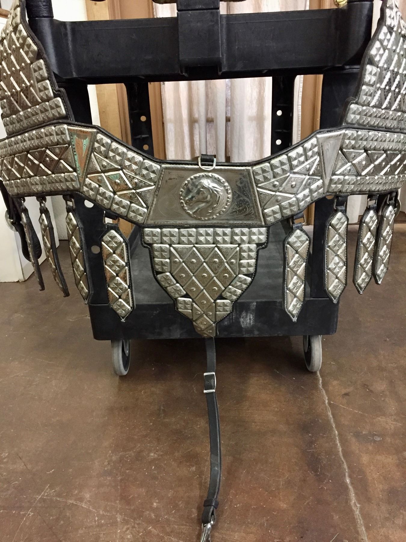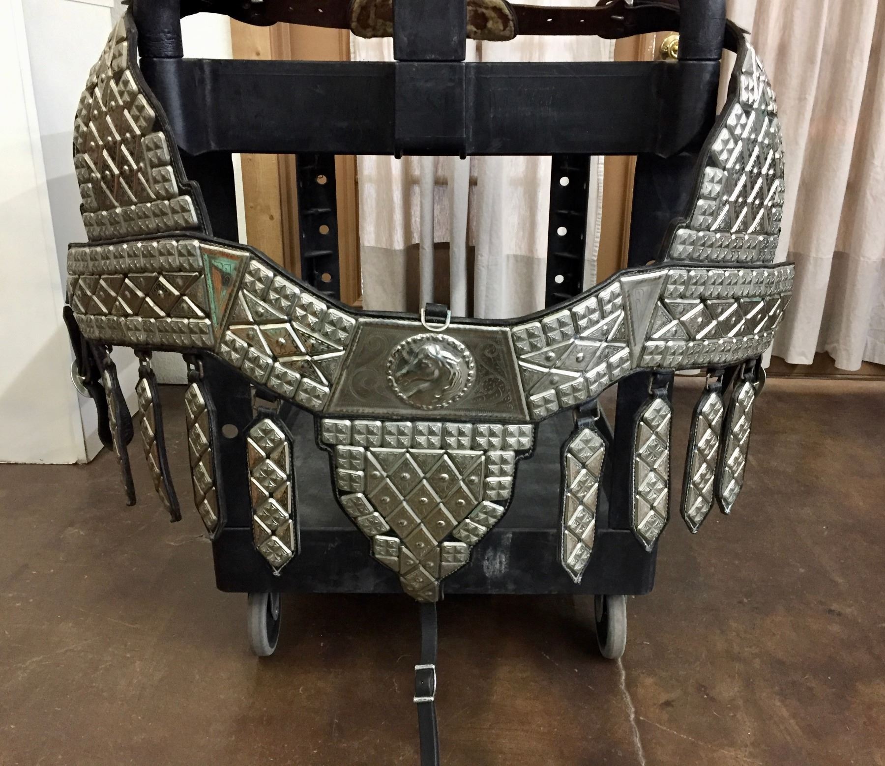 Description: Featured for sale in this lot is a large, Monel silver, highly decorated, parade style breast collar. Attributed to Ted Flowers. Maker: Ted Flowers (unsigned). Approx. Age: Vintage. Size: 41” wide. Condition: Good for its age, normal wear expected. Please look closely at the pictures - they are an important part of our description. Shipping: There will be a $15 handling / packaging fee for shipping this lot. The actual cost of postage will be added on top of that.