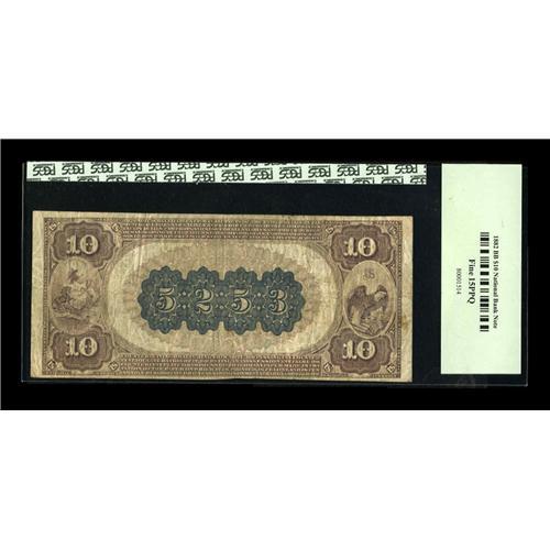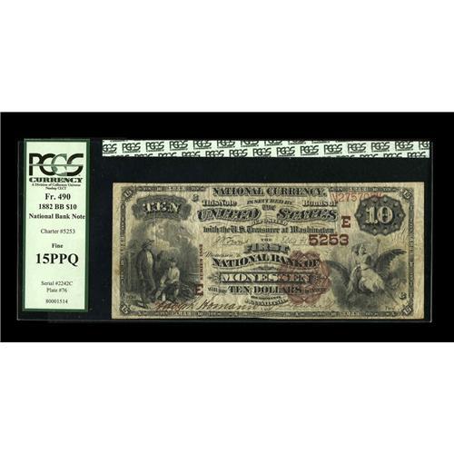 <B>Monessen, PA</B></I> - $10 1882 Brown Back Fr. 490 <B>The First NB </B></I> Ch. #(E)5253<BR>This was the first of three issuers chartered here and issued large size under three titles. This nomenclature is the second, the census showing only four survivors with this name. The $10 Brown Back we offer here has been certified as <B>PCGS Fine 15PPQ</B></I> and displays strong officers' ink signatures. A challenging type from an elusive bank.