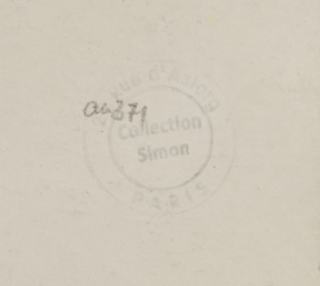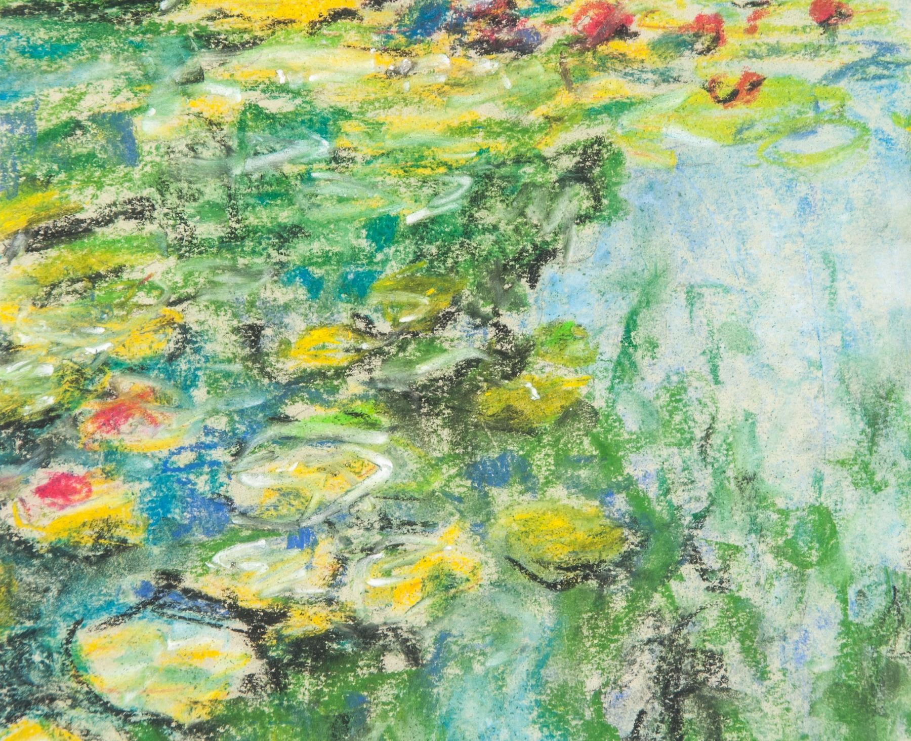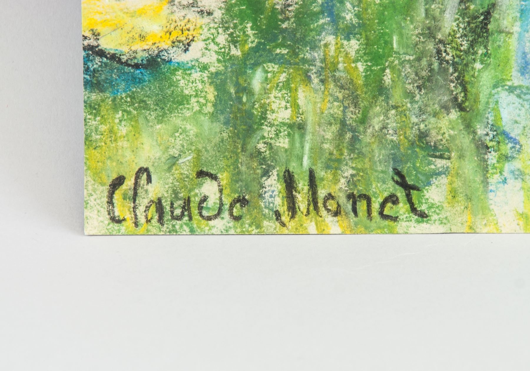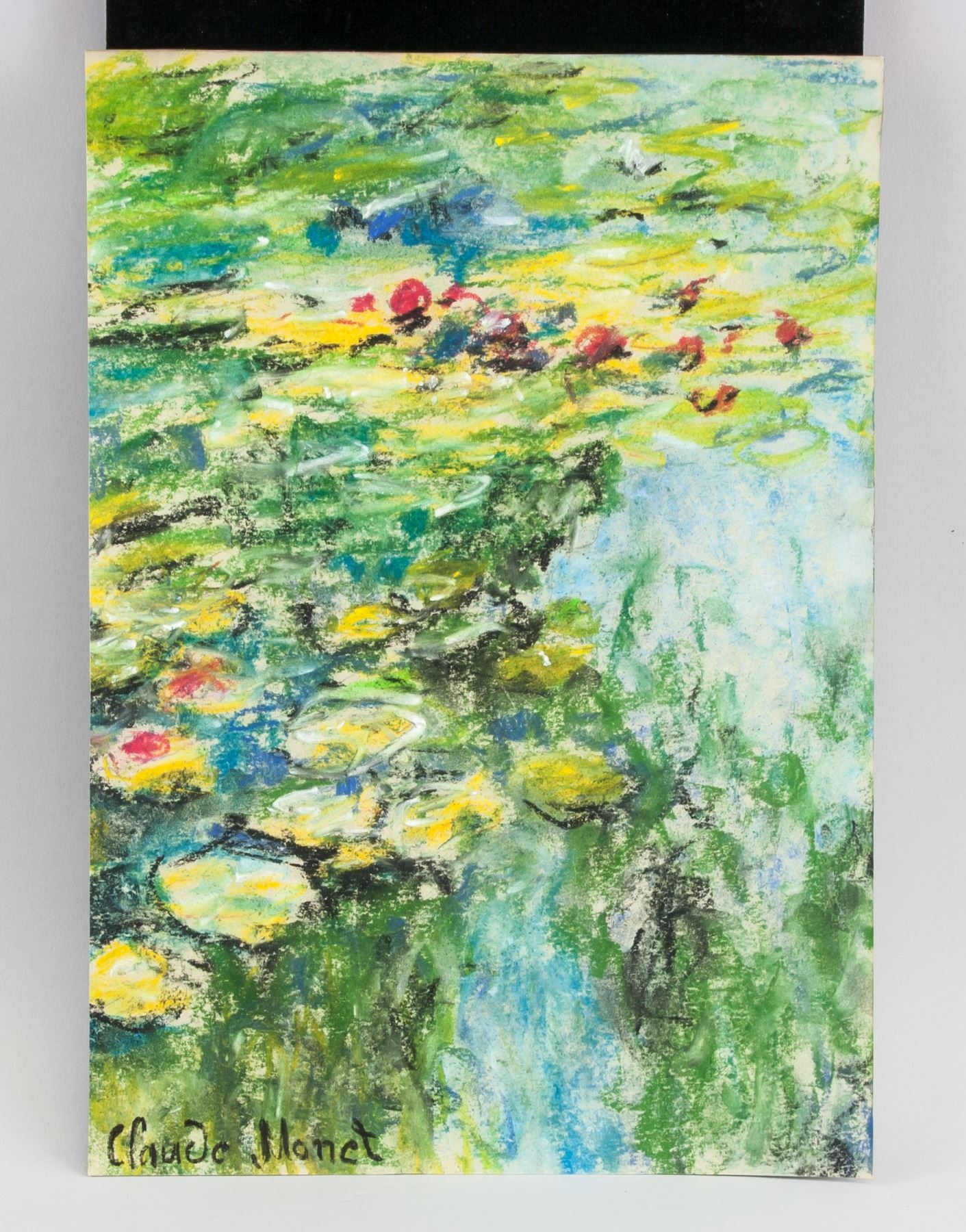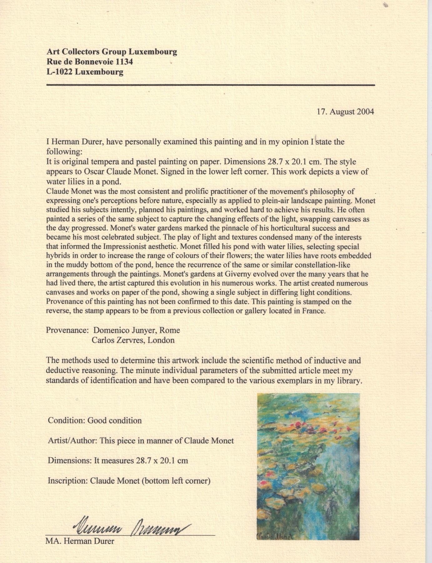 Tempera and pastel impressionist painting on paper, featuring water lilies in a pond. Signed and attr. Oscar Claude Monet (French, 1840-1926) in the lower left corner. 11.29 x 7.91 inch (28.7 x 20.1 cm). Accompanied with certificate from Art Collectors Group Luxembourg. Claude Monet was the most consistent and prolific practitioner of the movement’s philosophy of expressing one’s perceptions before nature, especially as applied to plein-air landscape painting. Money studied his subjects intently, planned his paintings, and worked hard to achieve his results. He often painted a series of the same subject to capture the changing effects of the light, swapping canvases as the day progressed. Monet’s water gardens marked the pinnacle of his horticultural success and became his most celebrated subject. The play of light and textures condensed many of the interest that informed the Impressionist aesthetic. Monet filled his pond with water lilies, selecting special hybrids in order to increase the range of colours of their flowers; the water lilies have roots embedded in the muddy bottom of the pond, hence the recurrence of the same or similar constellation –like arrangements through the paintings. Monet’s gardens at the Giverny evolved over the many years that he had lived there, capturing the evolution in his numerous works. The artist created numerous canvases and works on paper of the pond, showing a single subject in differing light conditions. Provenance of this painting has not been confirmed to this date. This painted is stamped on the resverse, the stamp appears to be from a previous collection located in France. PROVENANCE: Domenico Junyer, Rome. Carlos Zevres, London. Acquired from above by present owner