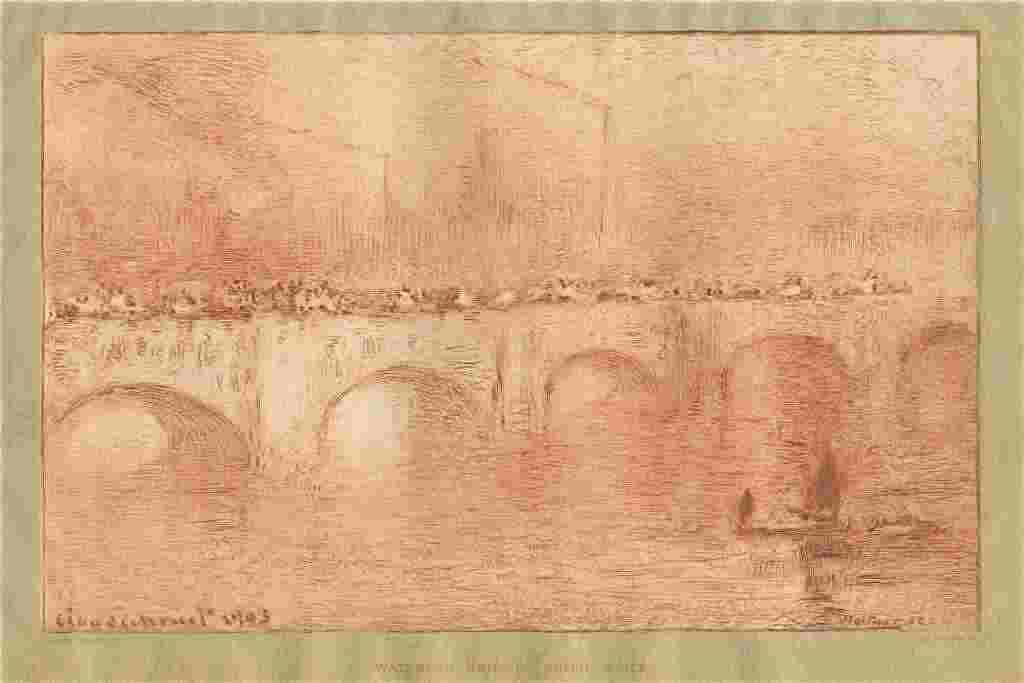 Claude Monet Etching "Waterloo Bridge, Soliel Voilé" - Etched By French Artist Charles Waltner (1846-1925) After Monet. Catalogue Reference: Sanchez & Seydoux 1904-13. This Is A Beautiful And Subtle Impression In Sanguine Ink, Printed On Chine-Collé Paper. Published In 1904 By Gazette Des Beaux-Arts And Presented By The Publisher Mounted Onto A Green Support Sheet. Although The Support Sheet Has Some Age-Toning (As Is Usually Found With This Work), The Etching Is In Fine Condition. Image Size: 5 1/2 X 8 1/2 Inches (140 X 217mm) - Professionally Framed & Matted - Comes With Certificate - -