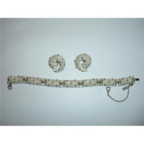 This is a well constructed set. The bracelet has a chain guard and metal Monet tag. The earrings are clip and marked Monet Patd.
