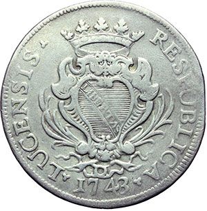 Monete e Medaglie di Zecche Italiane. Lucca. Repubblica (1369-1799). Scudo 1743. MIR 237/5. AG. g. 26.03 MB+/qBB.