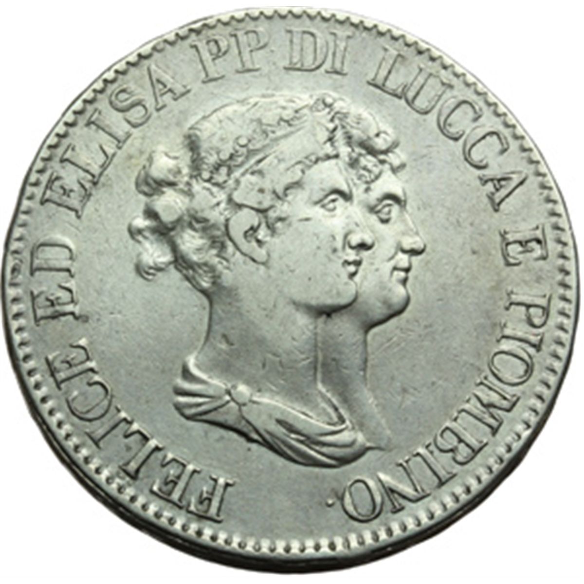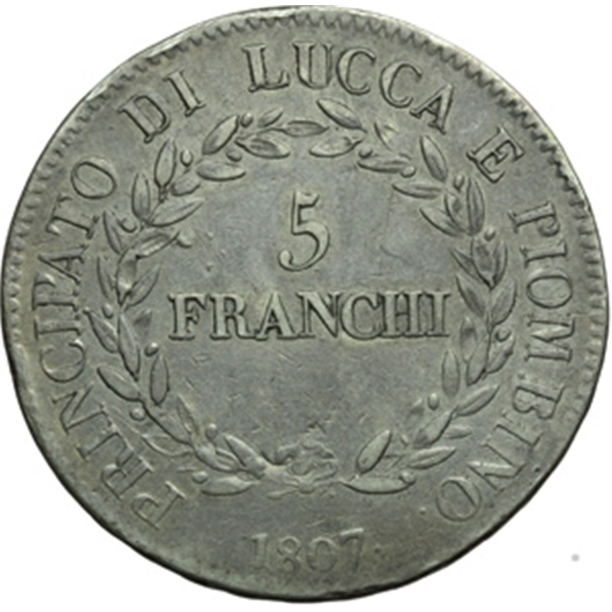 Monete e Medaglie di Zecche Italiane. Lucca e Piombino. Elisa Bonaparte e Felice Baciocchi (1805-1814). 5 franchi 1807. Pag. 253. Mont. 437. AG. R. Colpetti al ciglio. BB.
