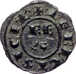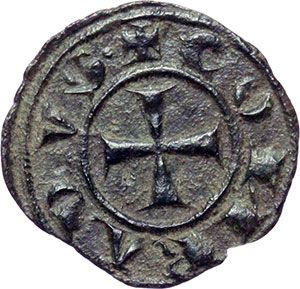 Monete e Medaglie di Zecche Italiane. Messina. Corrado I (1250-1254). Mezzo denaro. Sp. 157. MI. g. 0.30 RR. qSPL.
