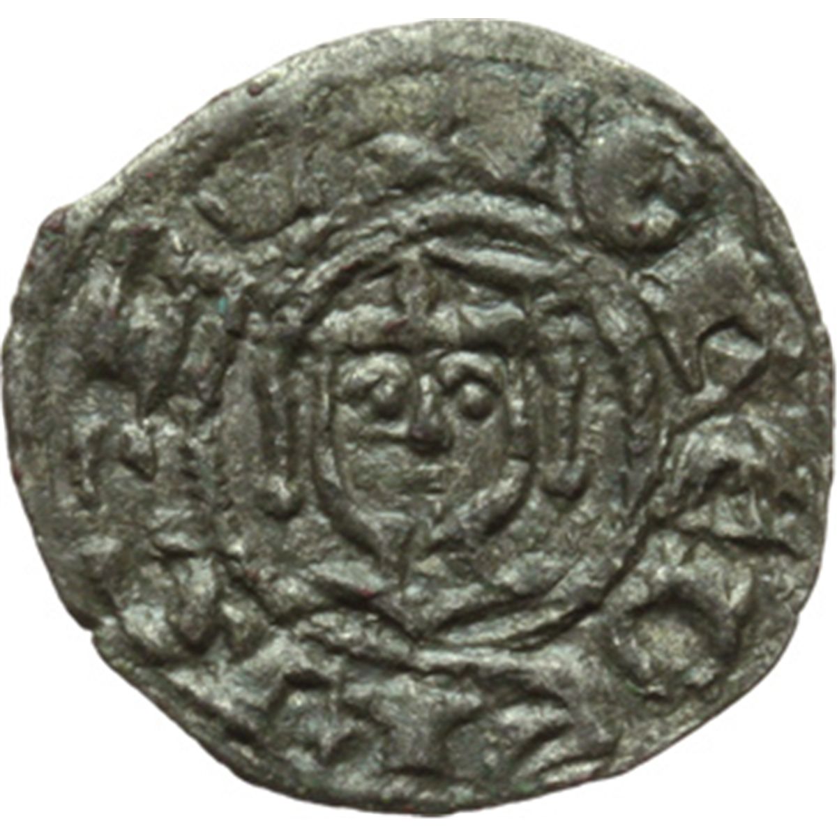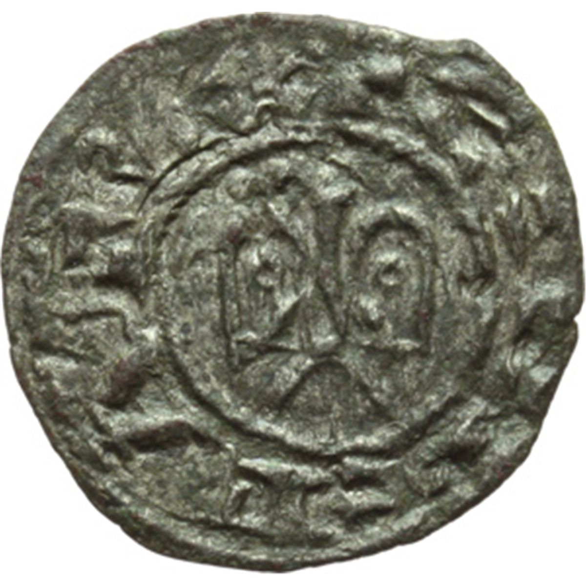 Monete e Medaglie di Zecche Italiane. Messina o Palermo. Enrico VI con il figlio Federico II (1196-1197). Denaro. MIR 58 o 464. Sp. 32. MI. g. 0.76 R. SPL.