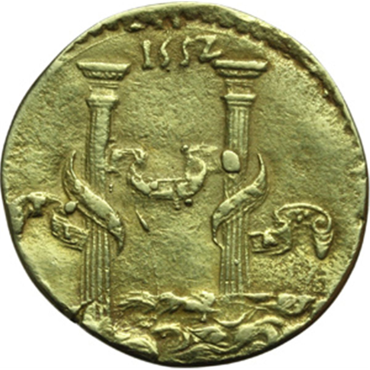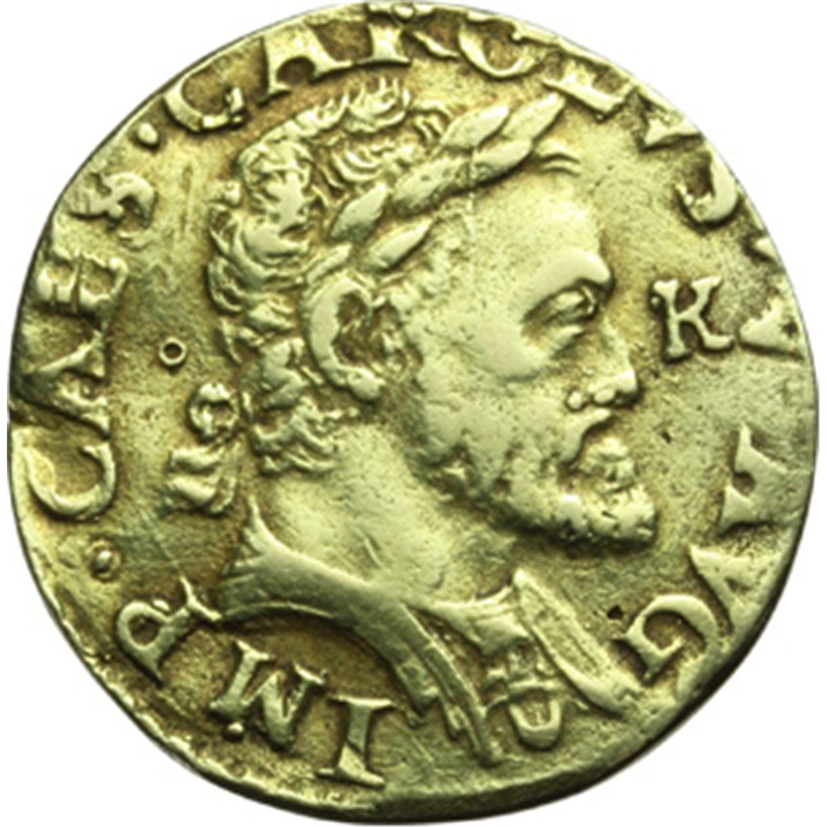 Monete e Medaglie di Zecche Italiane. Milano. Carlo V (1535-1556). Quarto di scudo d'argento 1552 con forte doratura o fusione successiva in oro. Cr. tipo 11/B. AG dorato. g. 9.56 RRRRR. Sul bordo lievi tracce di incastonatura in ciondolo. BB. In oro di questa tipologia sono conosciuti, rarissimi, doppi scudi del peso di circa g 6.76. Il nostro esemplare, tenendo conto anche della lieve perdita di metallo per togliere l'incastonatura, corrisponde per peso (g 9.56), ad un triplo scudo d'oro, peraltro inesistente in letteratura.