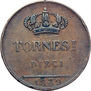 Monete e Medaglie di Zecche Italiane. Napoli. Ferdinando II (1830-1859). 10 tornesi 1839. MIR 518/11. P.R. 187. AE. g. 30.07 RRRR. BB.