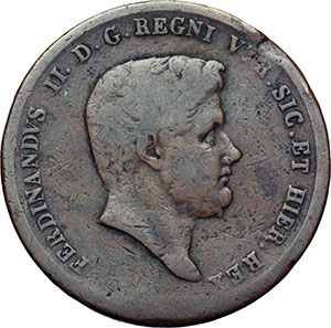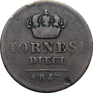 Monete e Medaglie di Zecche Italiane. Napoli. Ferdinando II (1830-1859). 10 tornesi 1847. MIR 520/3. P.R. 198 bis. AE. g. 29.78 RRRR. MB+/qBB.