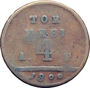 Monete e Medaglie di Zecche Italiane. Napoli. Ferdinando IV (1759-1816). 4 tornesi 1800. MIR 427/1. P.R. 19. AE. g. 10.83 RR. qBB.