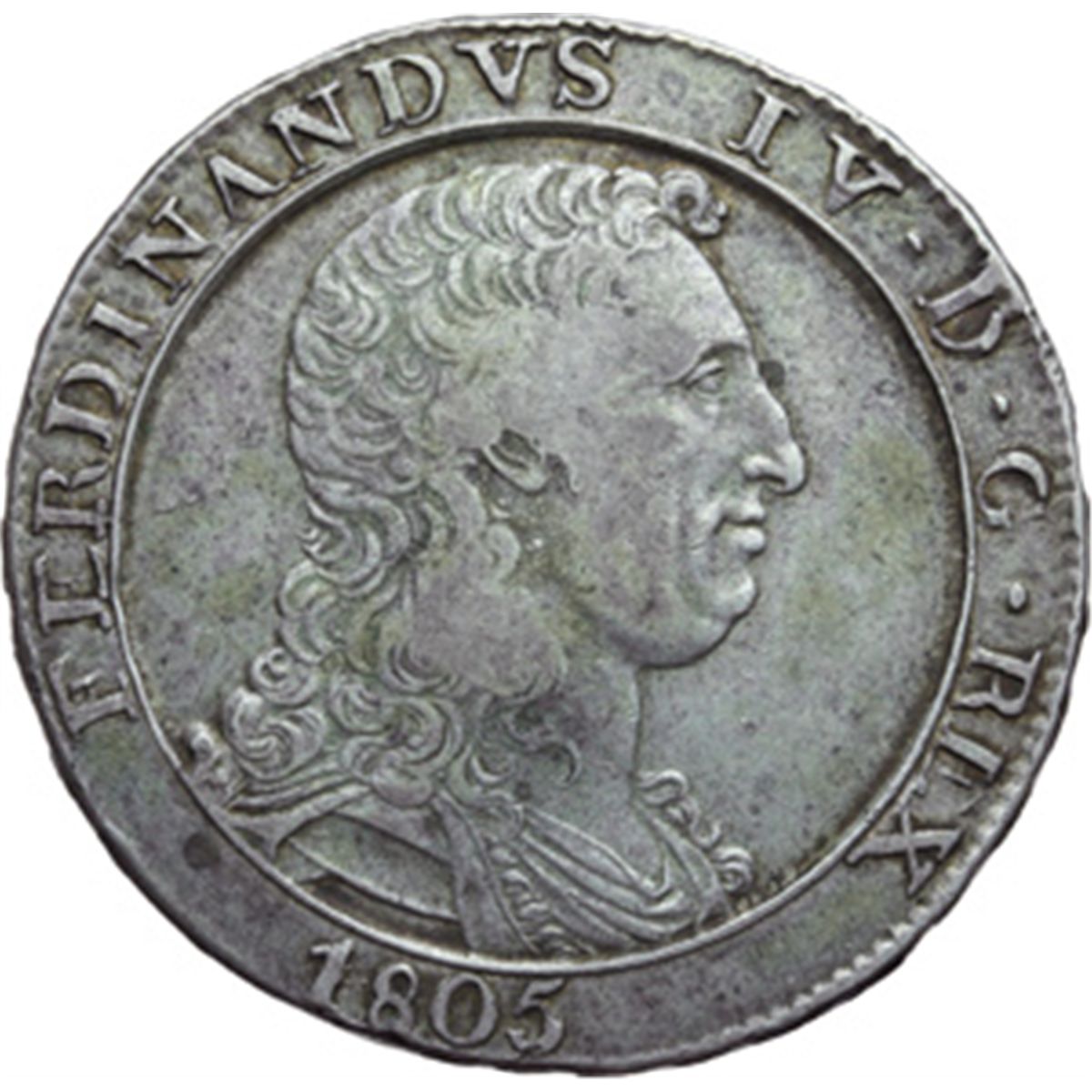 Monete e Medaglie di Zecche Italiane. Napoli. Ferdinando IV (1759-1816). Piastra 1805, capelli ricci. MIR 423. P.R. 9. AG. g. 27.43 MB+.