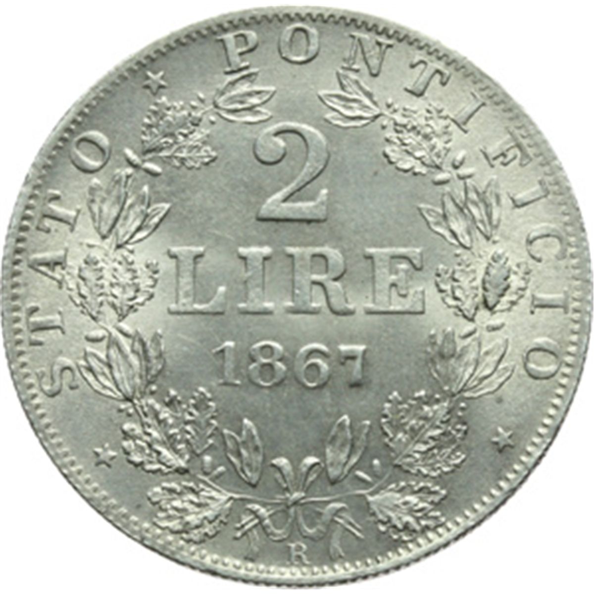 Monete e Medaglie di Zecche Italiane. Roma. Pio IX (1846-1870). 2 lire 1867, A. XXII. Pag. 558. Mont. 368. AG. SPL/qFDC.