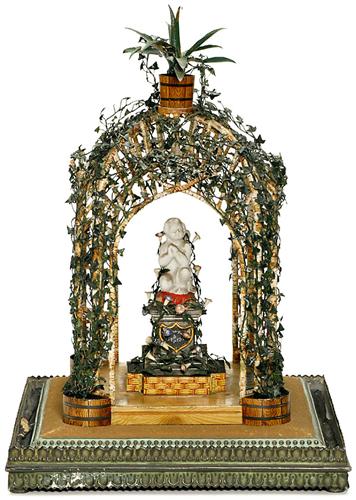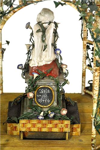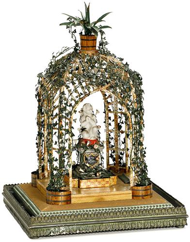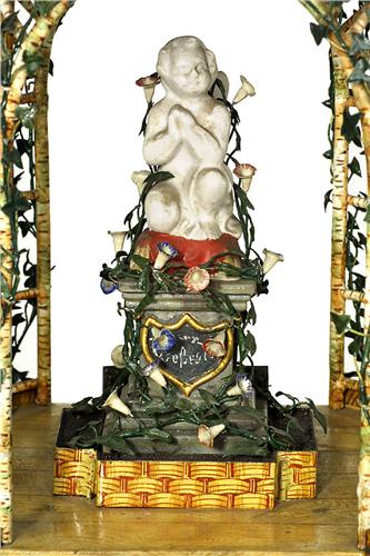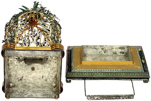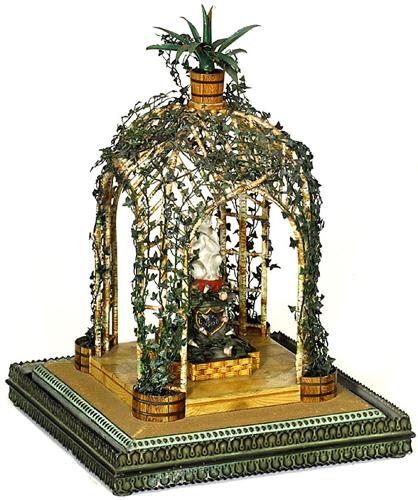 Money Bank "Pavilion" with Secret Drawer, c. 1890 Extremely filigree miniature shrine, handcolored tin, probably made in Germany by leading Württemberg tin smith manufacturer, dimensions: 10 x 10 x 133/4 in., porcelain angel, flowers, leafs and ornaments made of thin tinplate, remarkably realistic coloration, with concealed coin slot under the angel, pavilion opens-up! With leaded glass cover (one side with crack). - First class original condition without any new paint (one side with crack). A giant rarity of highest museum quality! - No other one known worldwide!<Br>
