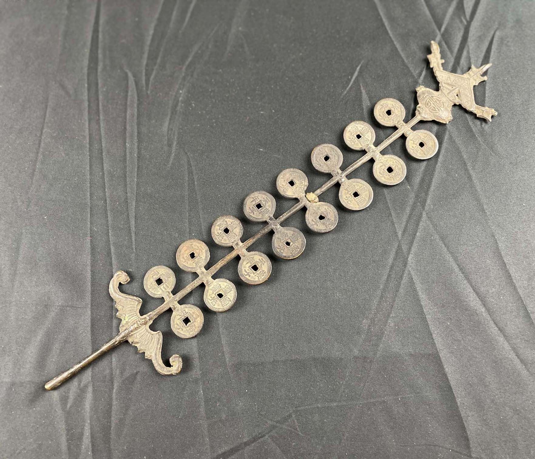 Description: China, 16-piece brass "money tree" for the birthday of Emperor Dao Guang, 1821-51, with charms alternating obverse and reverse, reading "dao-guang- tong-bao" and "dian-zi-wan-nian" (May the Son of Heaven live a myriad of years), pagoda at top, bat at bottom. Housed in very old, blue silk custom case with three fasteners (case somewhat worn). Illustrated in NNP edition, https://nnp.wustl.edu/library/book/541824?page=370, right, third from top. Very rare and in high demand.