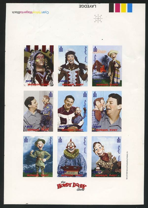 Mongolia, 1999, The Howdy Doody Television Show issue, a selection of imperf. color trials. Scott 2349 vars. Including the set of 9 as issued + 5 color trials, plus a set of 7 color trials of the souvenir sheet, VF