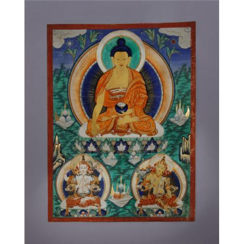 In this finely detailed and colorful Mongolian work, Shakyamuni