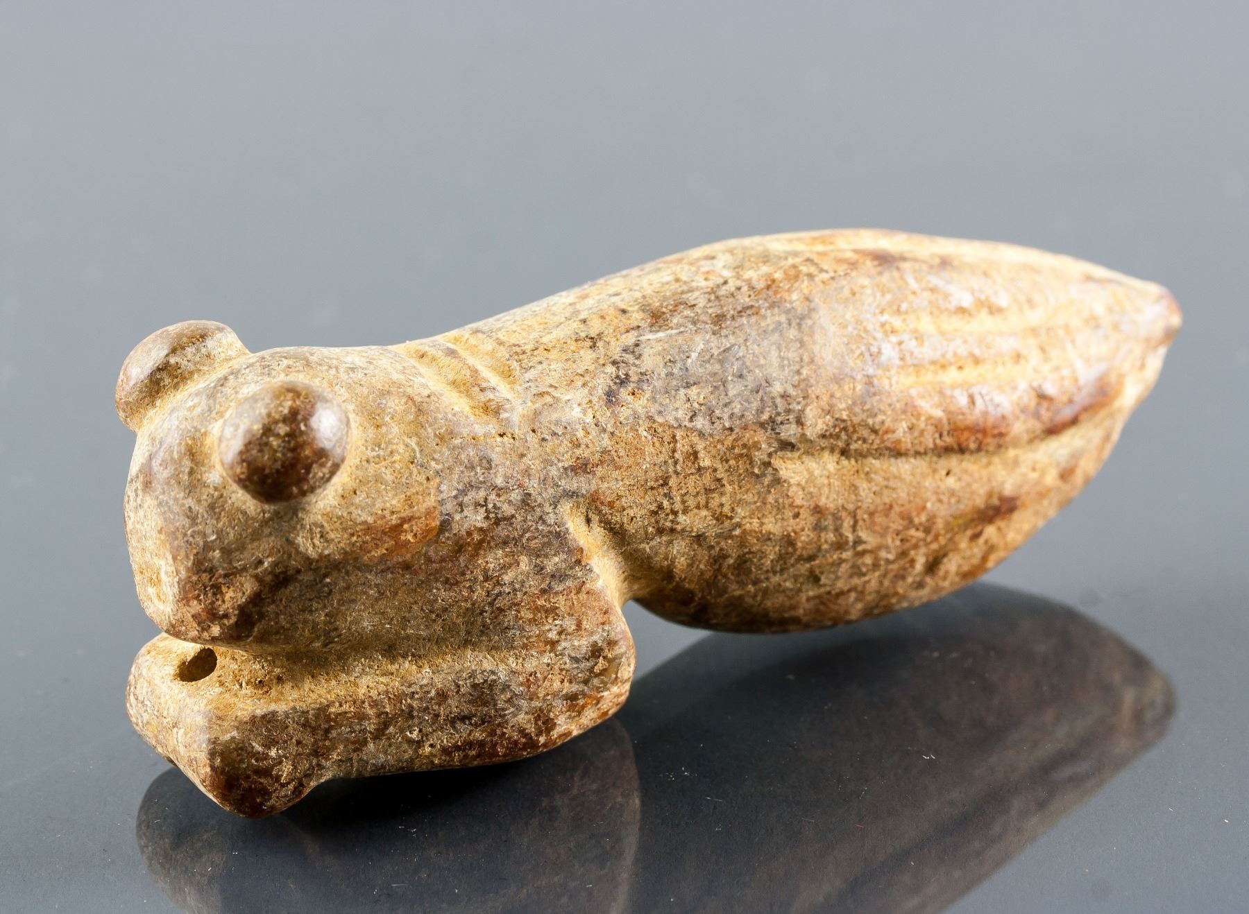 Mongolian neolithic style hardstone carved pendant, of praying mantis form, pierced for suspension, 7.5 x 2.5 cm, 69 grams