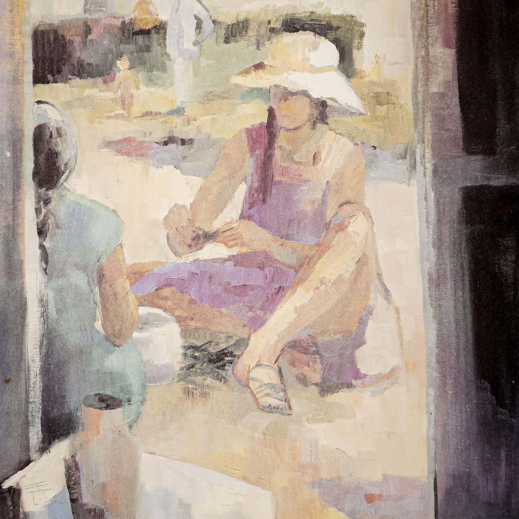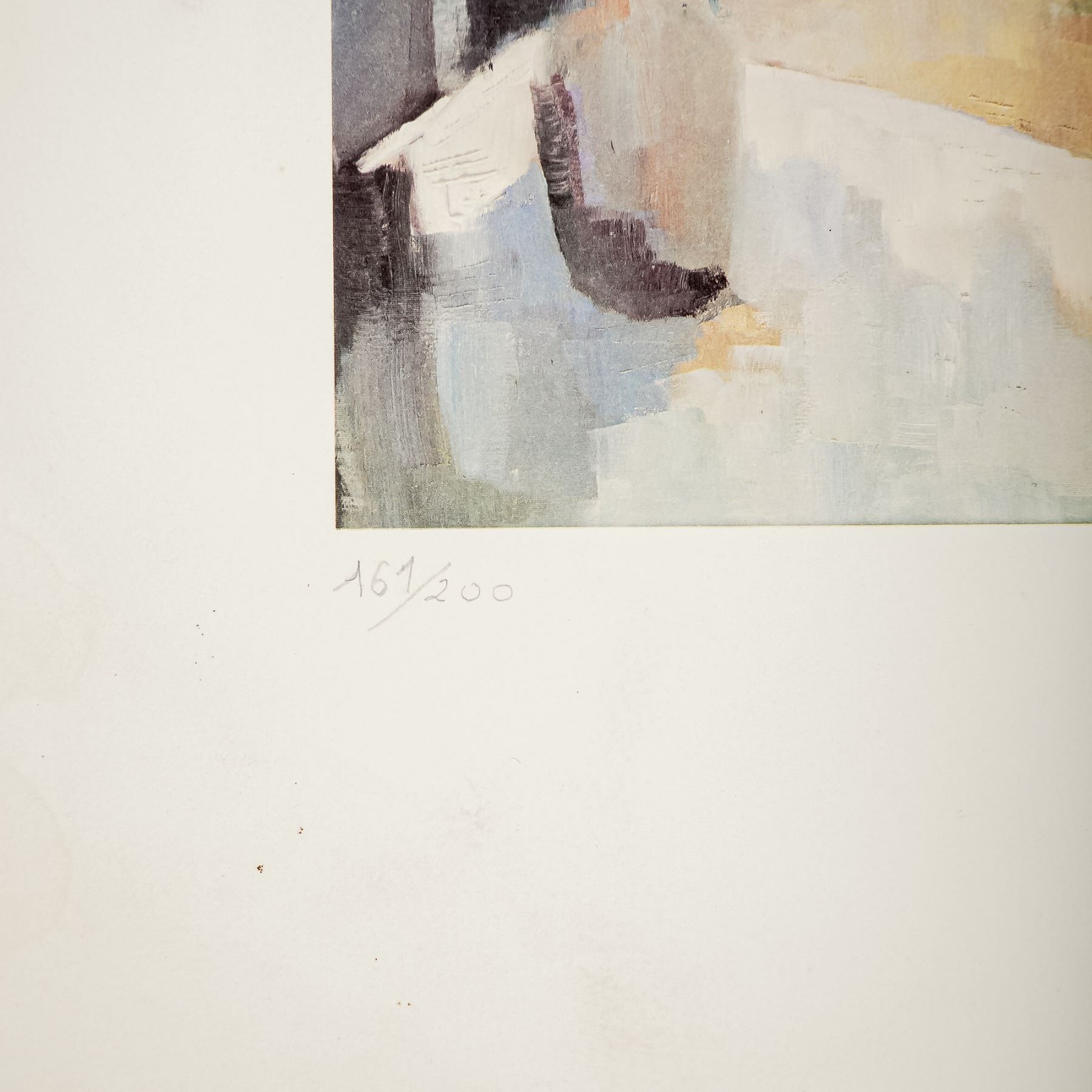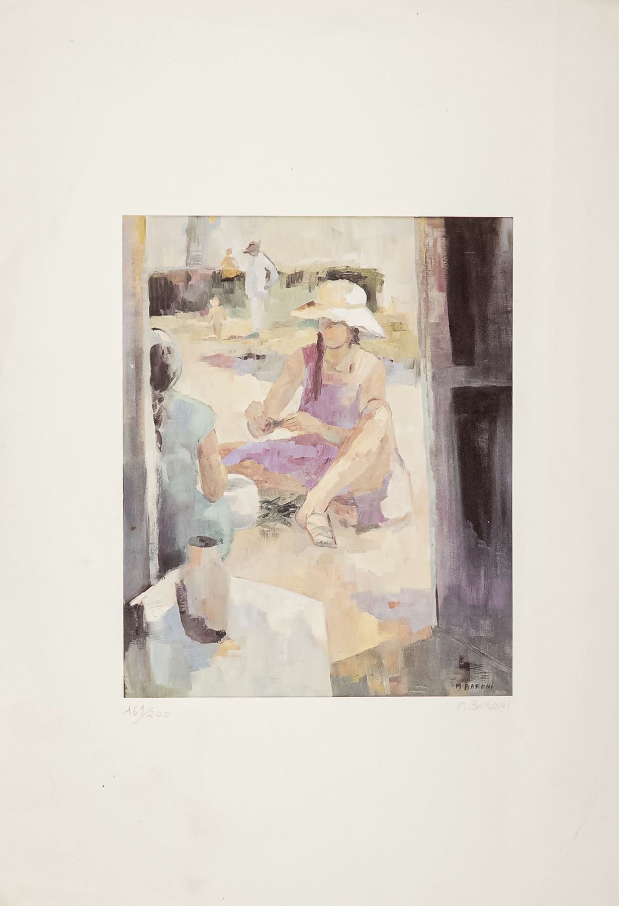 French artist Monique Baroni captures a serene outdoor scene with her distinctive impressionistic style, blending soft tones and geometric brushstrokes. This limited edition lithograph depicts a woman in a sunhat seated in conversation, framed by a relaxed summer setting. The work reflects Baroni's celebrated ability to balance figuration with abstraction, creating a timeless composition of light and leisure. A fine example of her modern French artistry and an evocative addition for collectors of 20th-century European prints. Signed in pencil by the artist and numbered 167/200.