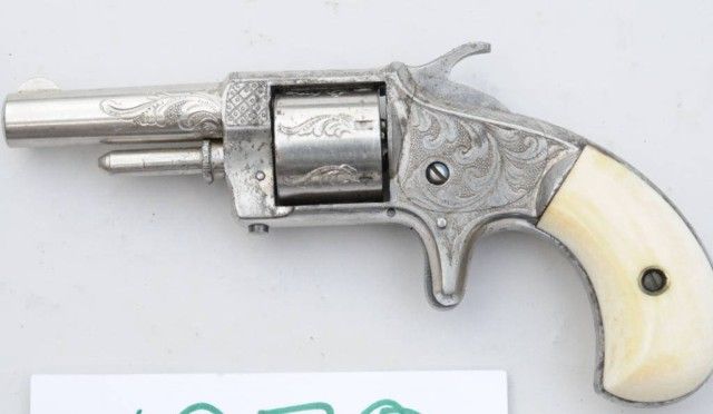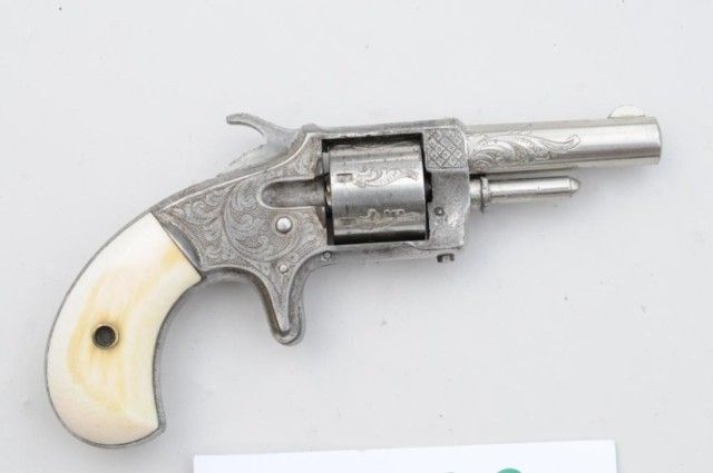 Monitor .22 cal., spur trigger frontier era revolver with N.Y. scroll engraving and period ivory grips, #12370; 50-70% evenly drifting nickel finish; good to very good overall; the engraving may be the shop ofL.D. Nimschke as it is his style. Est.: $600-$1,200.