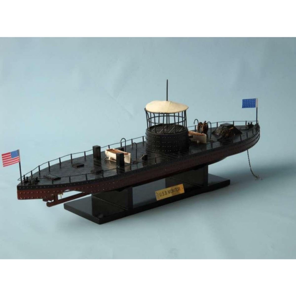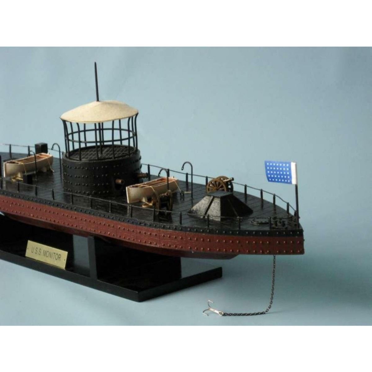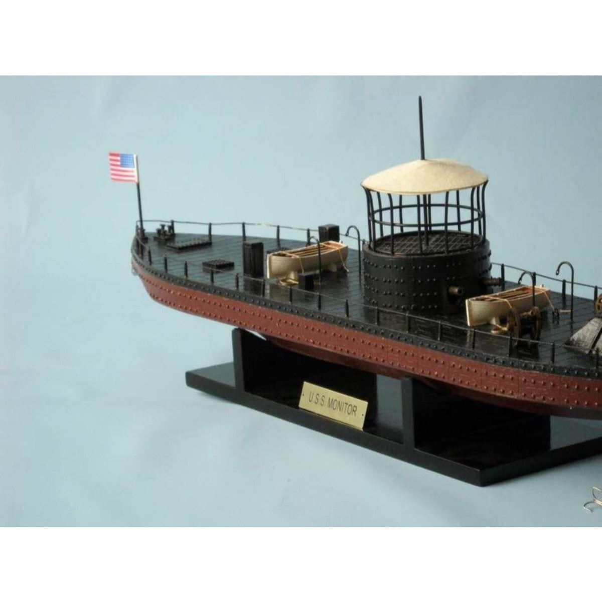 Monitor Limited Civil Warship Model 21" SOLD FULLY ASSEMBLED Ready for Immediate Display - Not a Model Ship kit Produced as a Limited Edition ironclad model of the famous USS Monitor, this museum-quality scale Civil War replica of the most influential and unique warship in history are certain to enthrall even the most discriminating naval historian or Civil War buff. Fine-craftsmanship and careful detailing combine to produce truly impressive model warships that are ideal for display upon any shelf, table or desk. 21" Long x 5" Wide x 7" High (1:98 scale) Built from scratch by master artisans Accurate scale Civil War replica of the actual USS Monitor Individual hull plates carved into the hull 2 brass cannons in the turret Individual rivets along hull and turret Cleats, vent grates and other features on deck Brass propeller with an adjustable rudder Accurately hand-painted Cloth flags included with this USS Monitor model Wooden display base which separates from the USS Monitor model Metal nameplate included Museum Quality features and upgrades over our standard USS Monitor include: Metal cupola with cloth canopy atop turret Highly-detailed lifeboats with oars tied to deck Painted metal railing along entire deck Metal anchor and chain at bow Removable turret rotates 360 degrees Two field artillery cannon included with model Limited production run only 50 of this USS Monitor model Certificate of Authenticity individually numbered Civil War replicas signed by HMS Founder and Master Builder Richard Norris