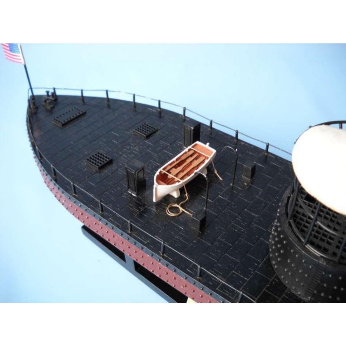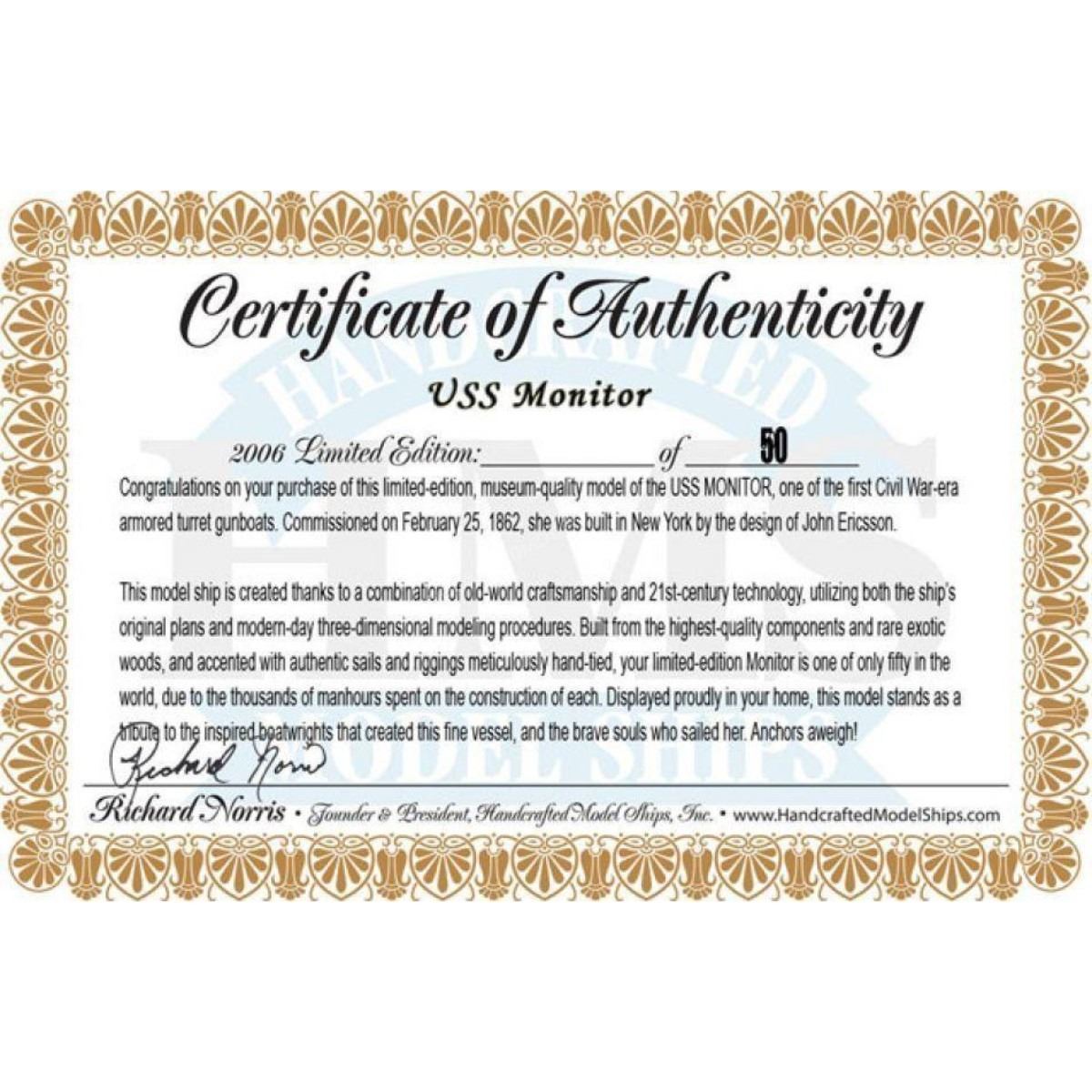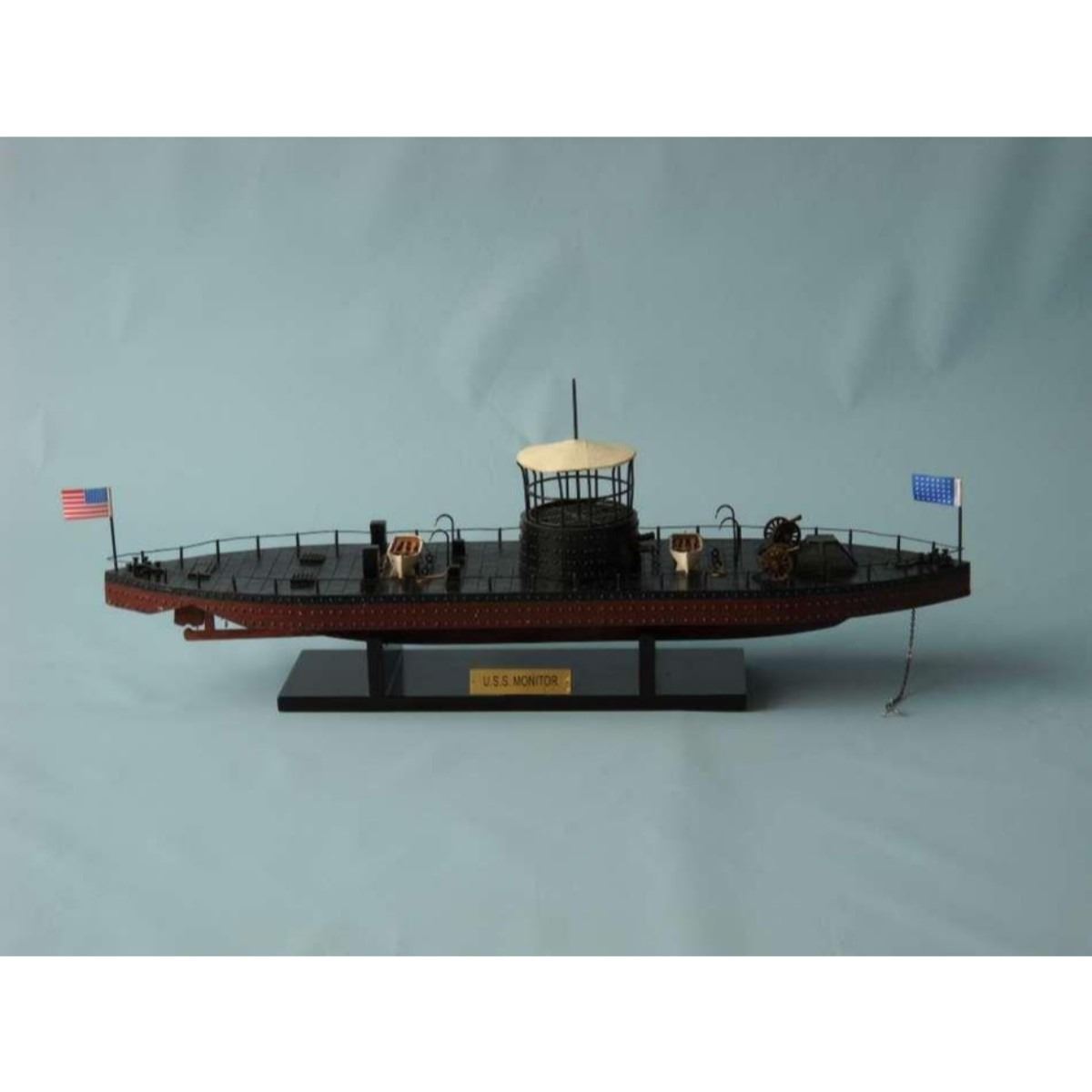 Monitor Limited Civil Warship Model 21" SOLD FULLY ASSEMBLED Ready for Immediate Display - Not a Model Ship kit Produced as a Limited Edition ironclad model of the famous USS Monitor, this museum-quality scale Civil War replica of the most influential and unique warship in history are certain to enthrall even the most discriminating naval historian or Civil War buff. Fine-craftsmanship and careful detailing combine to produce truly impressive model warships that are ideal for display upon any shelf, table or desk. 21" Long x 5" Wide x 7" High (1:98 scale) Built from scratch by master artisans Accurate scale Civil War replica of the actual USS Monitor Individual hull plates carved into the hull 2 brass cannons in the turret Individual rivets along hull and turret Cleats, vent grates and other features on deck Brass propeller with an adjustable rudder Accurately hand-painted Cloth flags included with this USS Monitor model Wooden display base which separates from the USS Monitor model Metal nameplate included Museum Quality features and upgrades over our standard USS Monitor include: Metal cupola with cloth canopy atop turret Highly-detailed lifeboats with oars tied to deck Painted metal railing along entire deck Metal anchor and chain at bow Removable turret rotates 360 degrees Two field artillery cannon included with model Limited production run only 50 of this USS Monitor model Certificate of Authenticity individually numbered Civil War replicas signed by HMS Founder and Master Builder Richard Norris