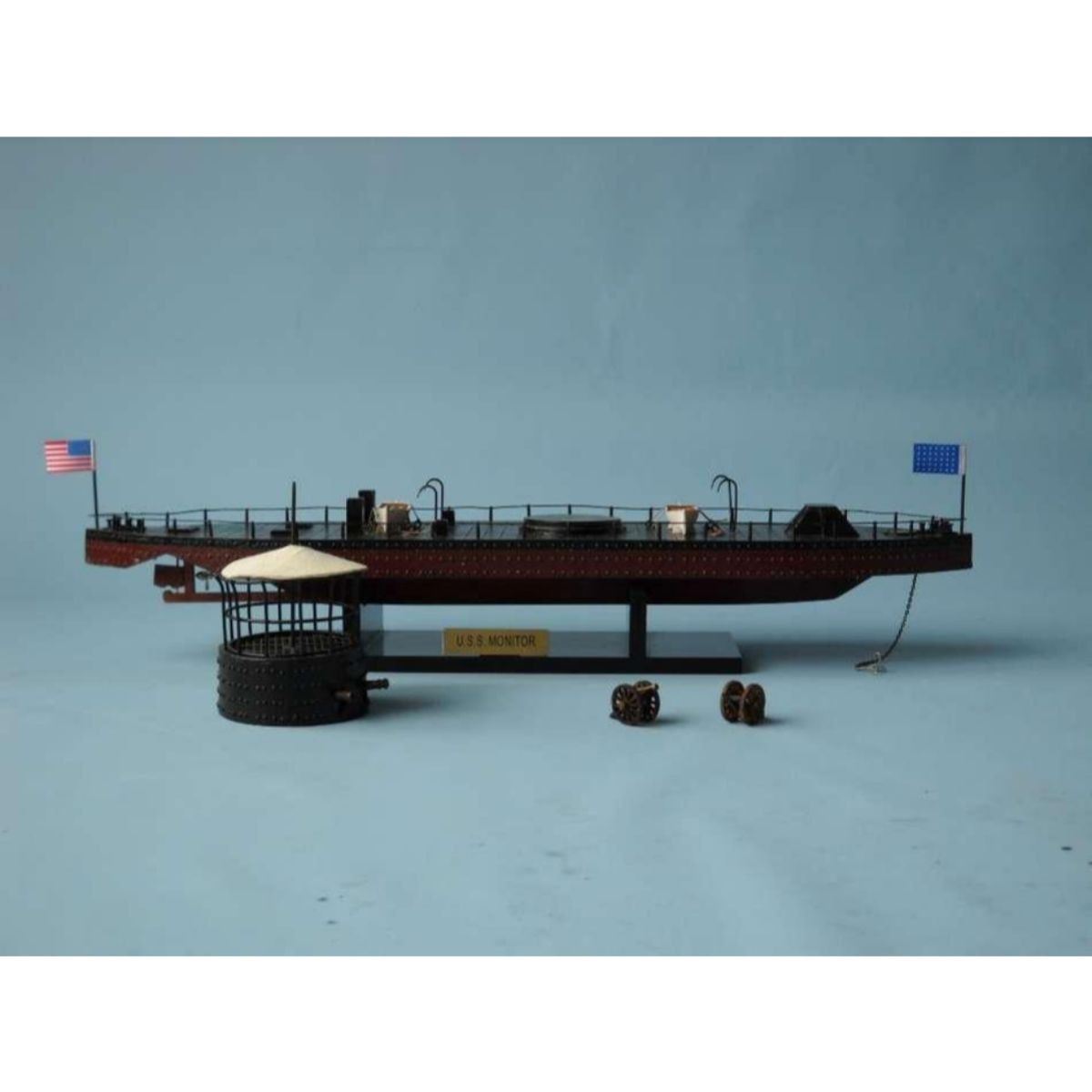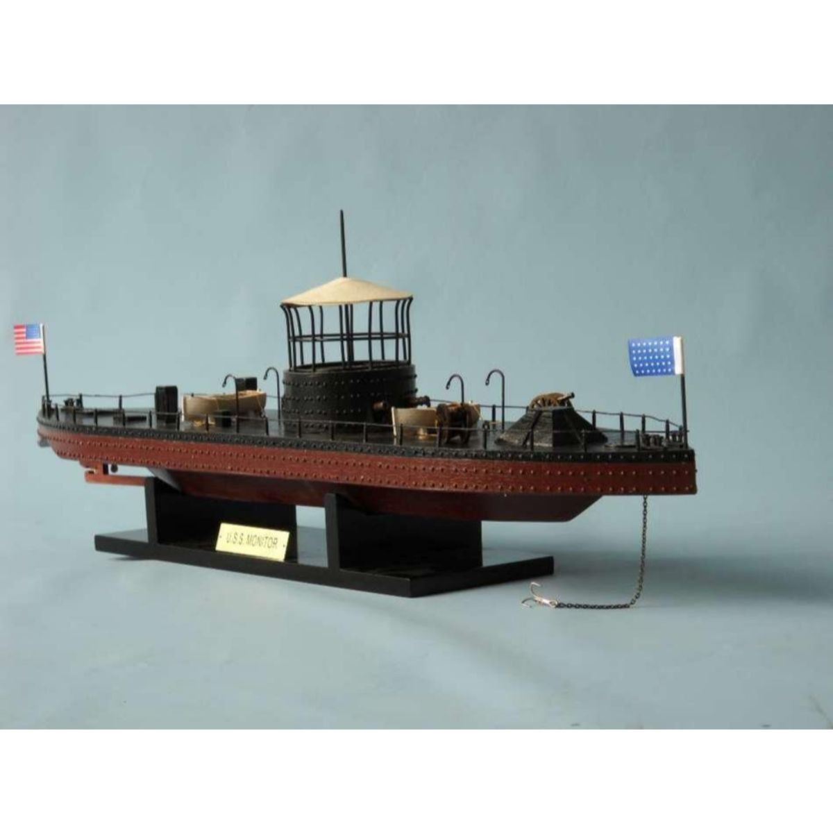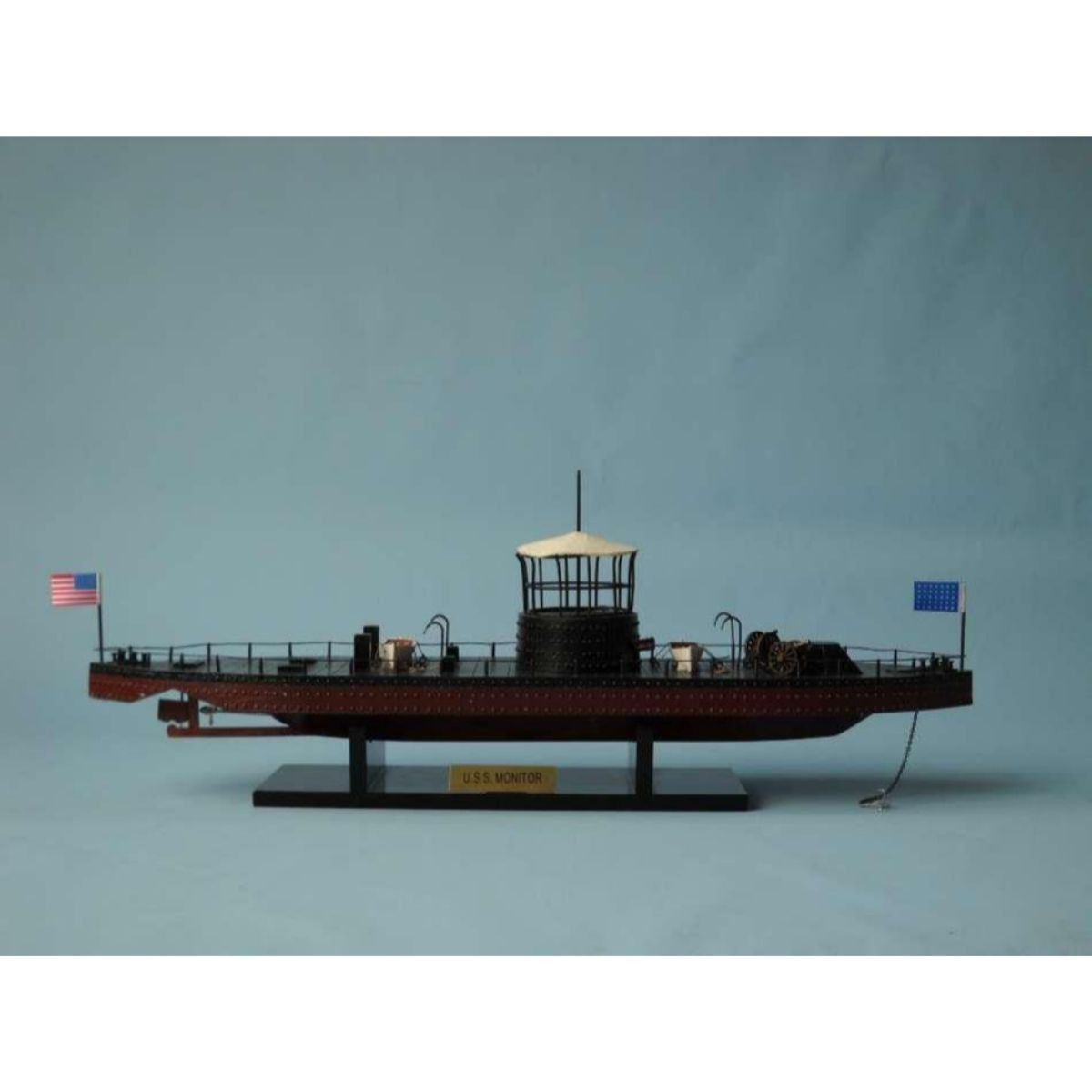 Monitor Limited Civil Warship Model 21" SOLD FULLY ASSEMBLED Ready for Immediate Display - Not a Model Ship kit Produced as a Limited Edition ironclad model of the famous USS Monitor, this museum-quality scale Civil War replica of the most influential and unique warship in history are certain to enthrall even the most discriminating naval historian or Civil War buff. Fine-craftsmanship and careful detailing combine to produce truly impressive model warships that are ideal for display upon any shelf, table or desk. 21" Long x 5" Wide x 7" High (1:98 scale) Built from scratch by master artisans Accurate scale Civil War replica of the actual USS Monitor Individual hull plates carved into the hull 2 brass cannons in the turret Individual rivets along hull and turret Cleats, vent grates and other features on deck Brass propeller with an adjustable rudder Accurately hand-painted Cloth flags included with this USS Monitor model Wooden display base which separates from the USS Monitor model Metal nameplate included Museum Quality features and upgrades over our standard USS Monitor include: Metal cupola with cloth canopy atop turret Highly-detailed lifeboats with oars tied to deck Painted metal railing along entire deck Metal anchor and chain at bow Removable turret rotates 360 degrees Two field artillery cannon included with model Limited production run only 50 of this USS Monitor model Certificate of Authenticity individually numbered Civil War replicas signed by HMS Founder and Master Builder Richard Norris