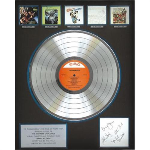 <B>The Monkees Limited Edition Autographed RIAA Multi-Platinum Sales Award.</B></I> Multi-platinum award released to commemorate the sale of a combined total more than 15 million albums, CDs, and cassettes from the Monkees' catalog, #85 in a limited edition of 2,500 signed by Michael Nesmith, Davy Jones, Peter Tork, and Mickey Dolenz. Framed to an overall size of 17" x 21" and in Excellent condition.<BR><BR><b>Shipping:</b> Framed - with Glass, Small (<a target="_blank" href="http://www.heritageauctions.com/common/shipping.php">view shipping information</a>)