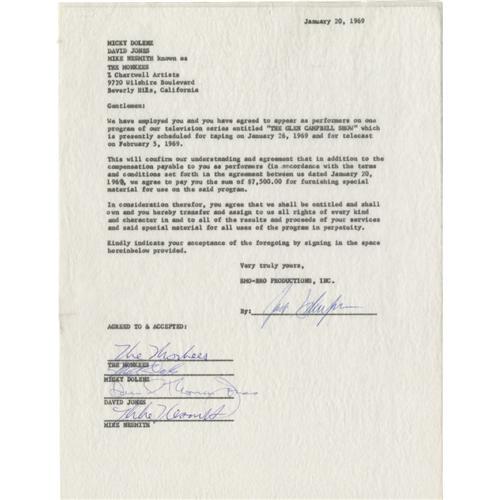 <B>Monkees Signed Television Contract.</B></I> One-page letter of assignment dated January 20, 1969, in which the Monkees agreed to give <I>The Glen Campbell Show</B></I> full rights for use of materials on the show during an appearance, in exchange for a fee $7,500 fee and performance compensation. Nice, bold signatures from David Jones, Mickey Dolenz, and Mike Nesmith, who added "The Monkees" above the three signatures. In Excellent condition with minimal wear. <I>Accompanied by a COA from PSA/DNA.</B></I><I>Accompanied by LOA from PSA/DNA.</B></I><BR><BR><b>Shipping:</b> Small Flat (<a target="_blank" href="http://www.heritageauctions.com/common/shipping.php">view shipping information</a>)