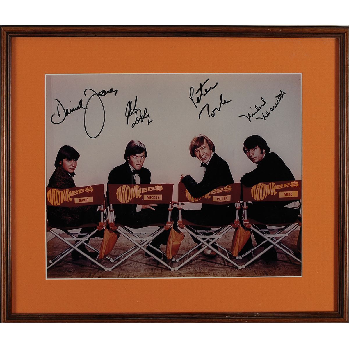 Color glossy 14 x 11 photo of the Monkees sitting in their personalized chairs, signed in black felt tip by David Jones, Mickey Dolenz, Peter Tork, and Michael Nesmith. Matted and framed to an overall size of 18.5 x 15.5. In fine condition.