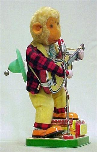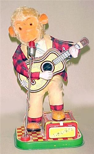 Monkey Playing Guitar; metal and plush battery operated toy; 11 1/2" high; no visible damage.