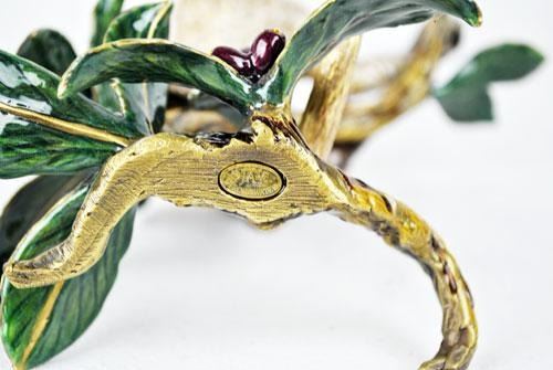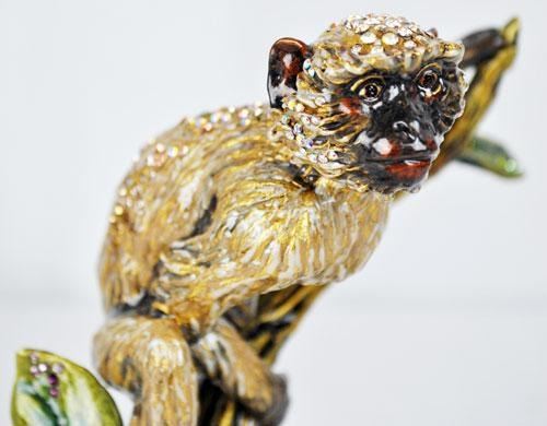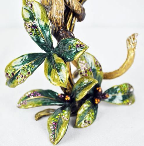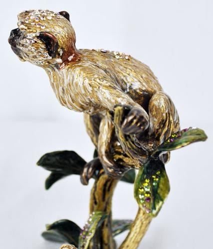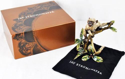Monkey on branch jungle edition jay strong water sculpture with original box and certificate of authenticity. Highly collectible and magnificent limited edition piece decorated with Swarovski crystals. About Jay Strongwater: Jay Strongwater's love of the elegant but vividly bejeweled objet—whether it's meant to rest on a tabletop or the graceful curve of a woman's neck—has led him on a journey through the worlds of fashion and home furnishings. He began his career while a student at the Rhode Island School of Design. After garnering raves for a necklace he'd made his mother, he took jewelry samples to open buyer days at some of New York's finest department stores, and soon a burgeoning business was born. At the age of 23, Strongwater met designer Oscar de la Renta, with whom he began to collaborate on jewelry designs for runway shows. The move to home accessories was delightfully serendipitous & organic. For the 1994 holiday season, Strongwater sent gifts of jewelencrusted filigree picture frames to friends, fashion editors, and buyers, who immediately fell in love with the design. By 1998, his Jewels for the Home collection had supplanted his fashion business. In essence, Strongwater created his own niche: the jeweler turning his meticulous eye and art toward a world beyond a woman's wrists, neck, and ears. Size: 7X5 inches.