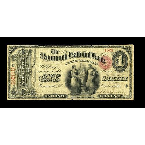 <B>Monmouth, IL</B></I> - $1 Original Fr. 382 <B>The Monmouth NB</B></I> Ch. # 1706<BR>This excessively rare bank has just two notes listed in the census, our offering tonight, which has been variously cataloged as Very Good and Fine in different auction appearances, as well as an Original $5. We've handled this note once before, at our Greater Cincinnati Numismatic Exposition Signature Sale in September of 2000, where it sold for what will appear after tonight to be a bargain at $715. <B>Very Good,</B></I> with reasonable claims to the next higher grade. The market for better Nationals is considerably stronger today than in when we last offered this elusive note, leading us to predict a realization in the range of...<BR><BR><b>Shipping:</b> Coin/Currency (<a target="_blank" href="http://www.heritageauctions.com/common/shipping.php">view shipping information</a>)