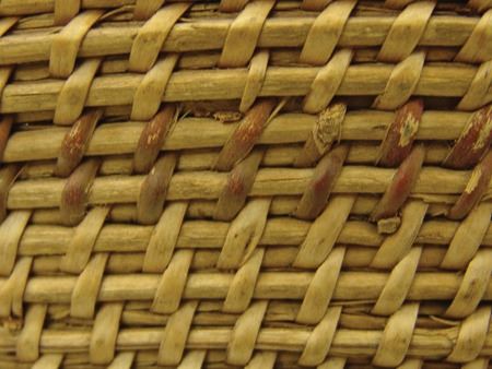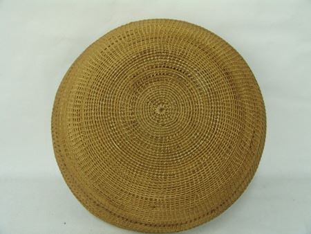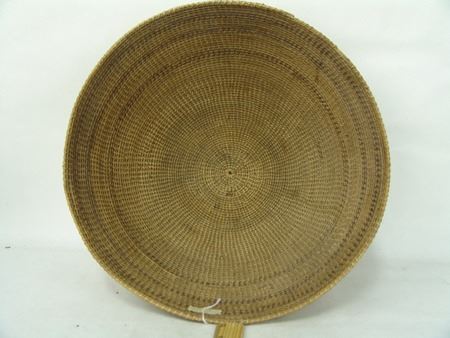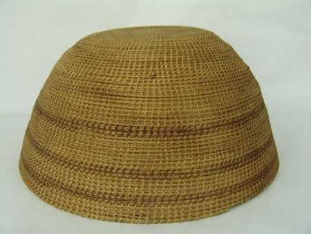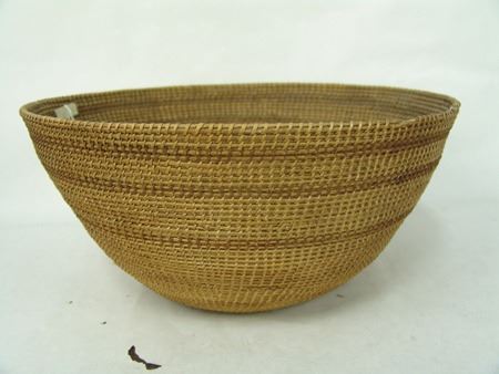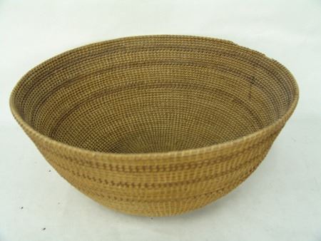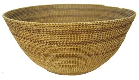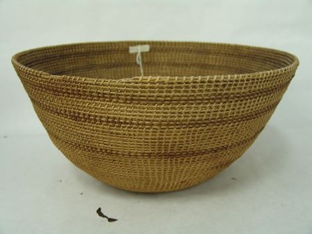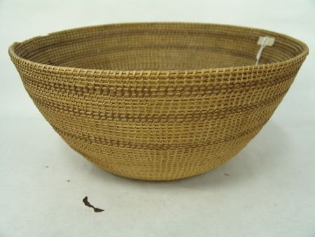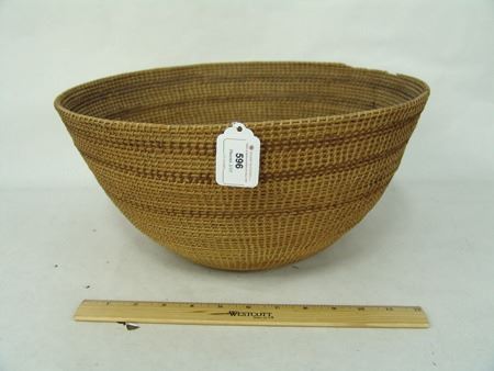 Early 1900s, Large deep flared bowl with simple (faded) color bands done in spaced stitch style. Very good overall condition with a few areas of missing/damaged stitches. 7-1/2" x 15-1/4"