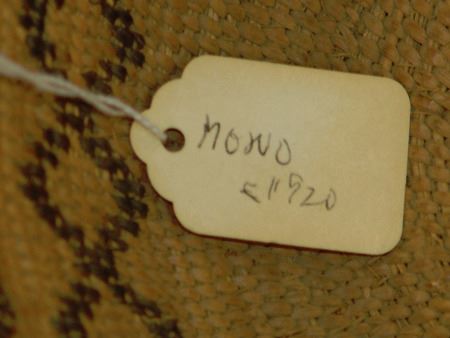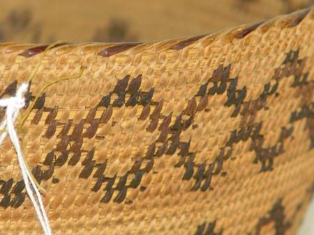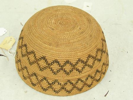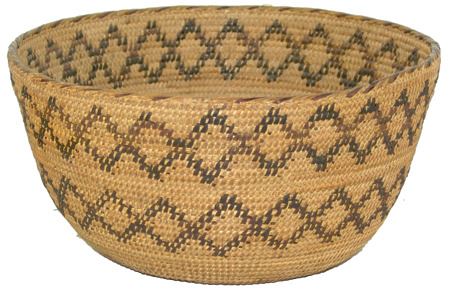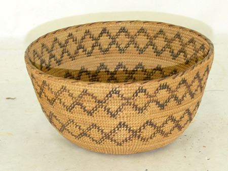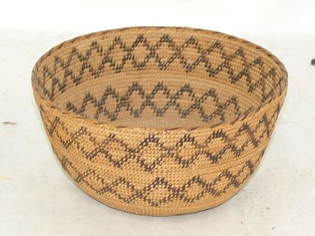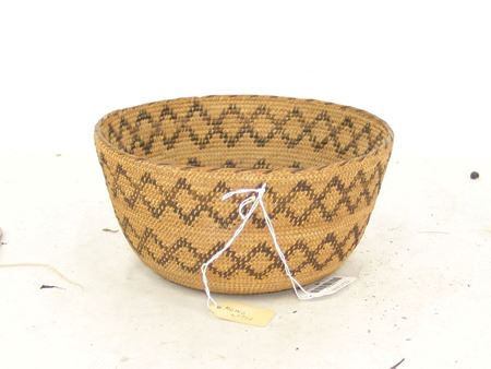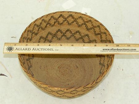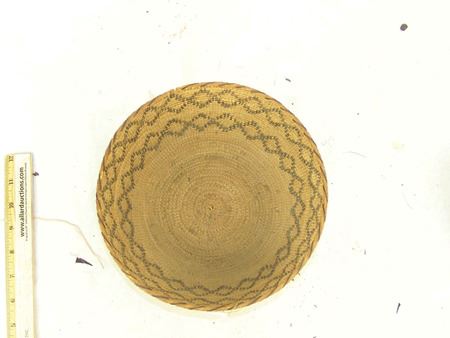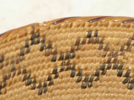 Early 1900s, Beautiful flared polychrome bowl with double rattlesnake band and two-color braided rim. Very good condition, minor stitch loss/damage. 4-1/2" x 8-1/2"