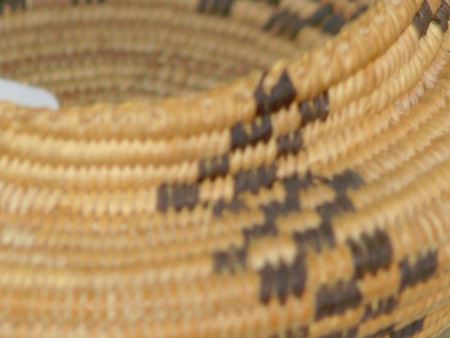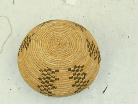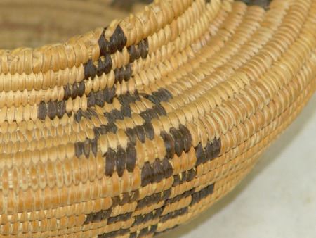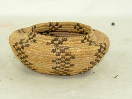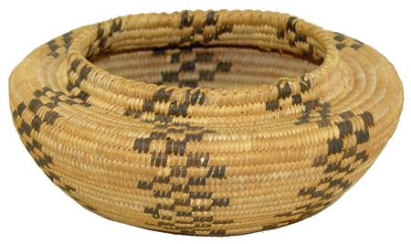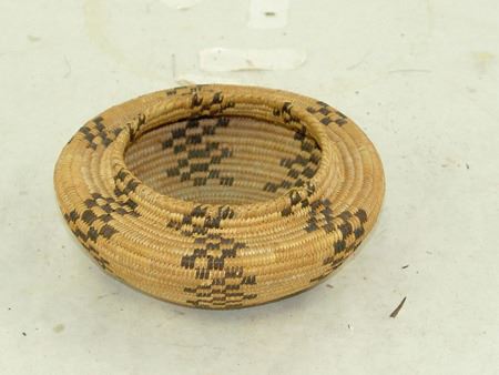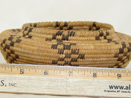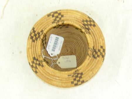 Early 1900s, Small tight weave low profile basket in rare bottleneck design and with vertical checkered sections. Very good condition. 2-1/2" x 6-1/2"