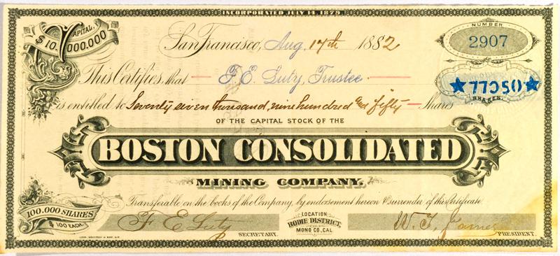Mono County,CA - August 17, 1882 - Boston Consolidated Mining Company Stock :