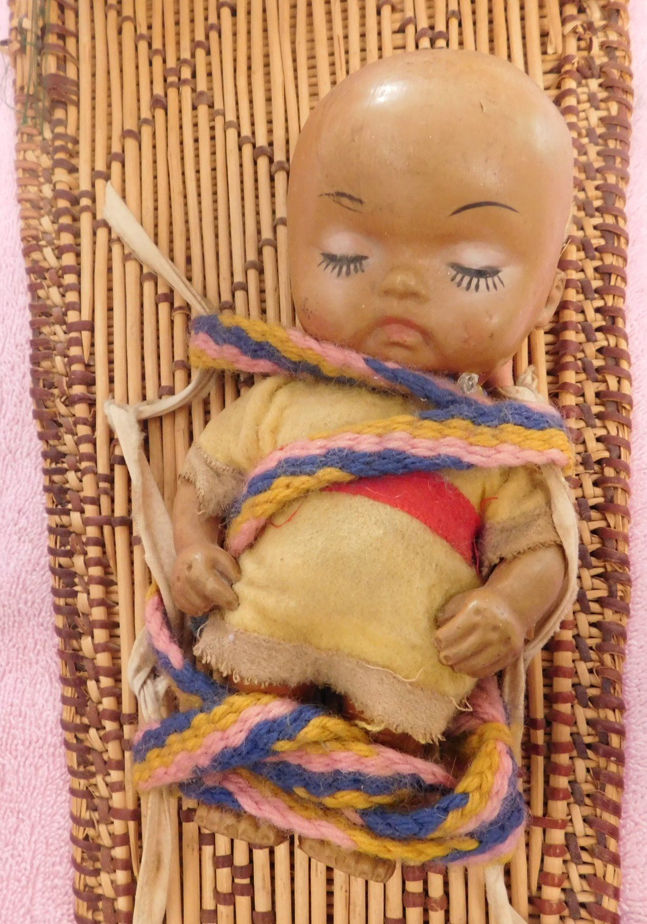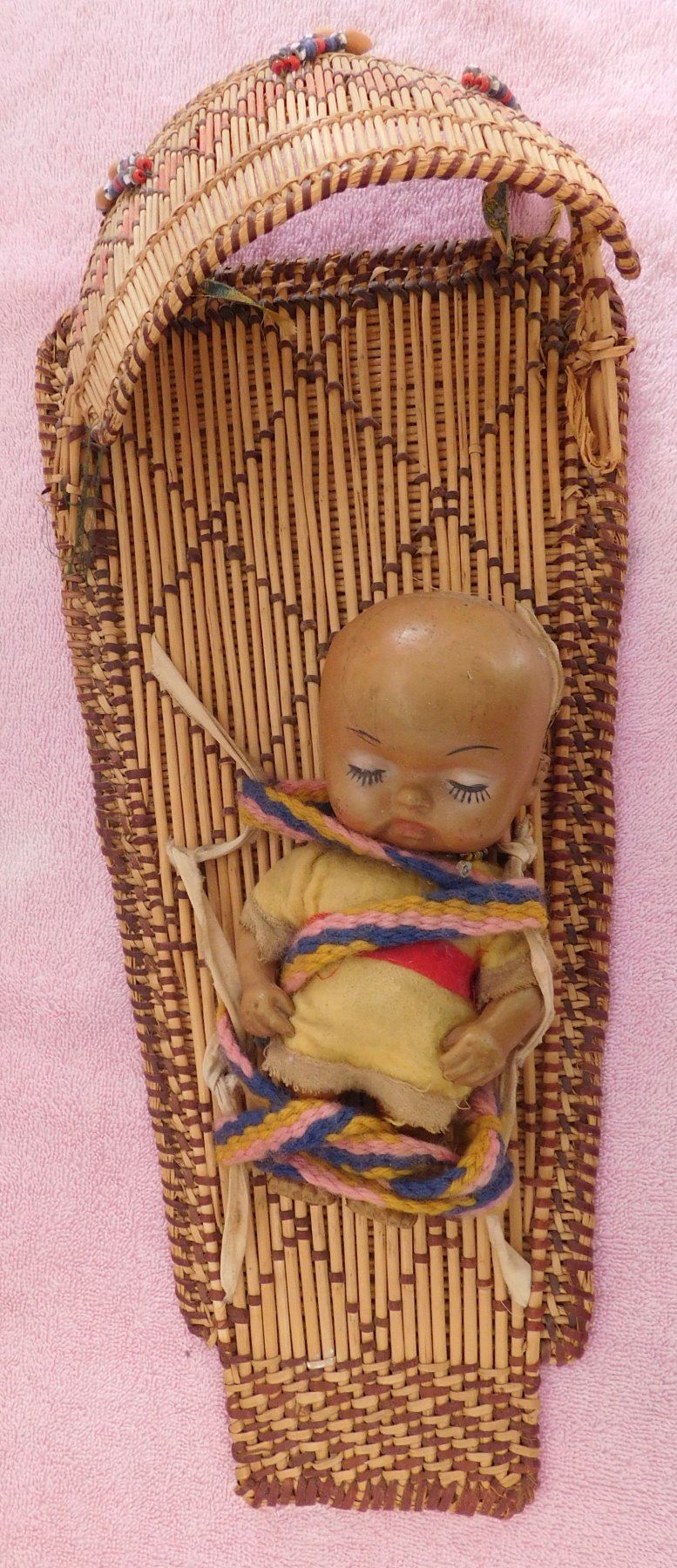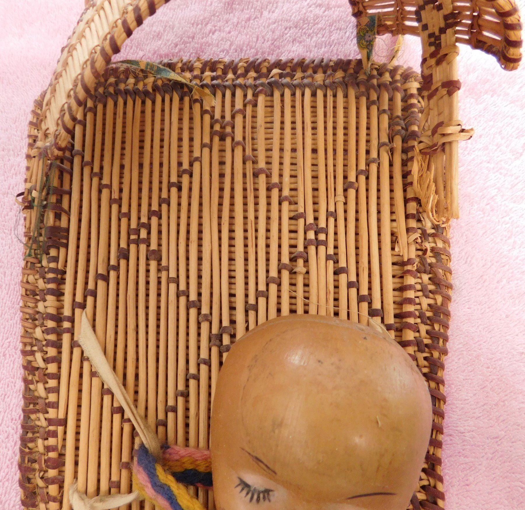 Mono Cradleboard, circa 1900. Made of wicker and wood, the item measures 15.5" x 7" x 4". Eastern California. Beautiful old doll basketry cradleboard with old doll. Condition: Sun visor has damage, see images. Shipping: $32.50 due to length, w/insurance and signature.