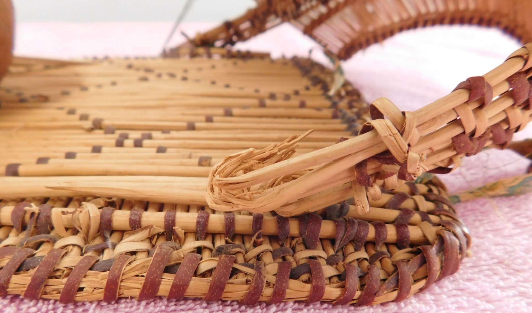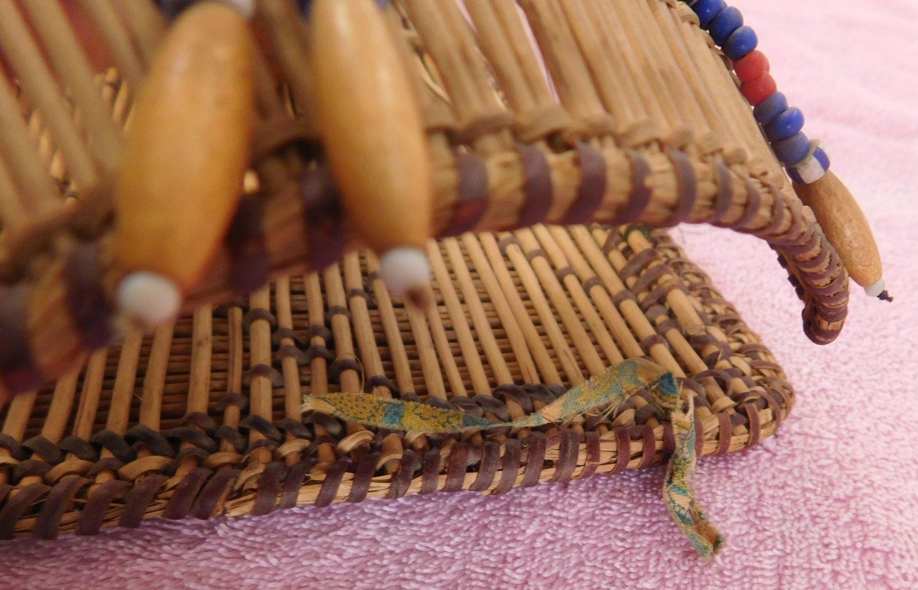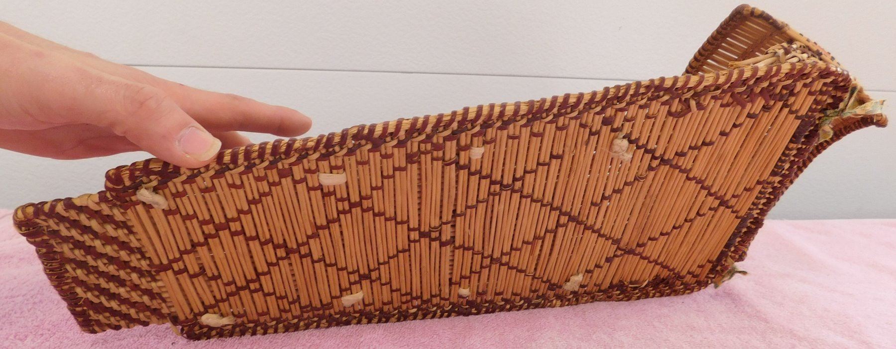 Mono Cradleboard, circa 1900. Made of wicker and wood, the item measures 15.5" x 7" x 4". Eastern California. Beautiful old doll basketry cradleboard with old doll. Condition: Sun visor has damage, see images. Shipping: $32.50 due to length, w/insurance and signature.