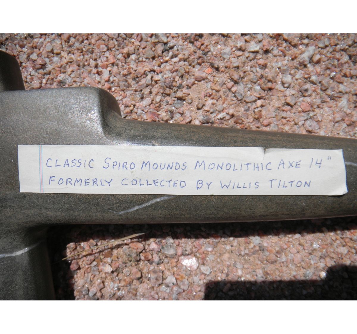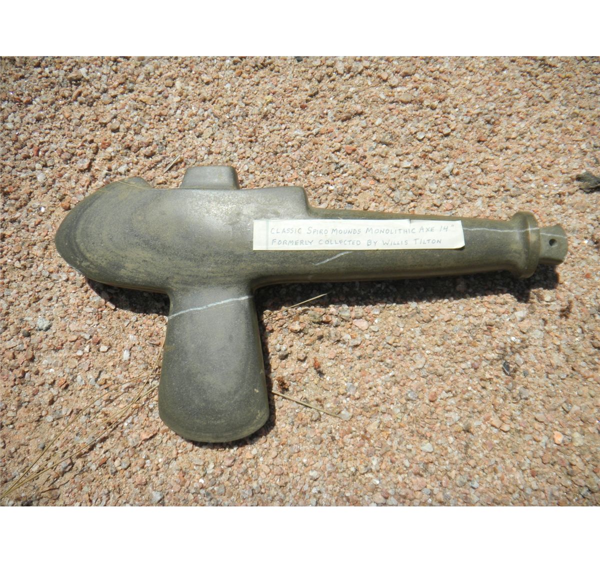 Ceremonial Stone Ax. Handle and Axe are all one stone. This item measures 14x8x2 inches. This item was collected by Willis Tilton. Spiro mound. Circa 1000 AD. Very fine condition. Shipping 20.00