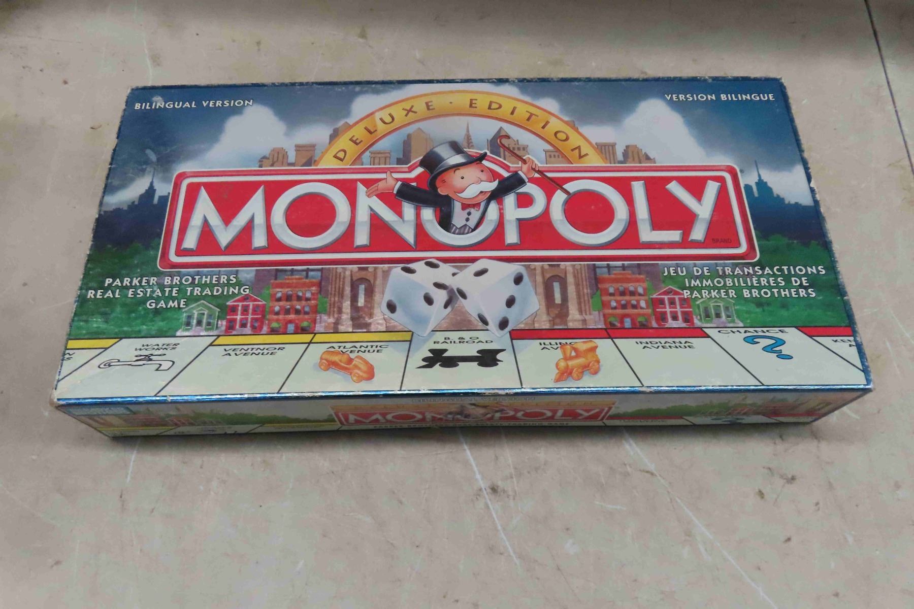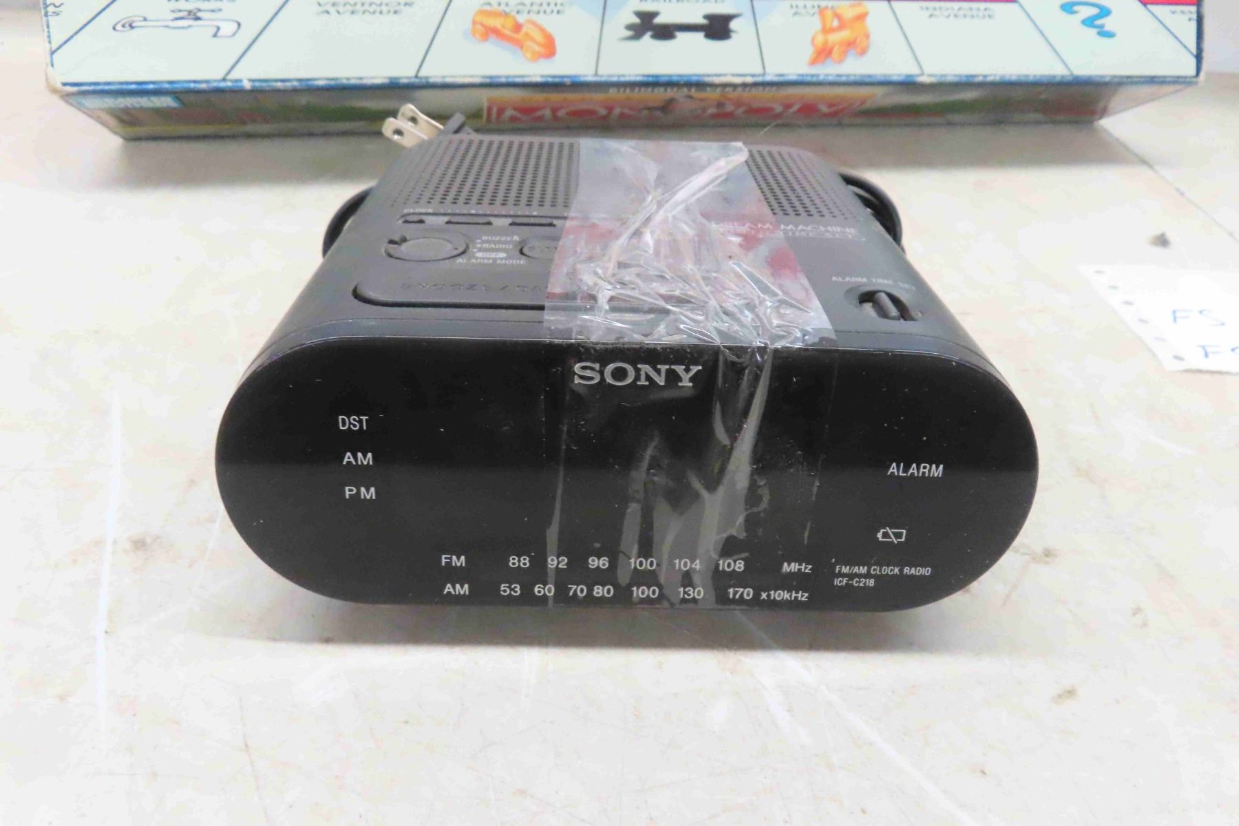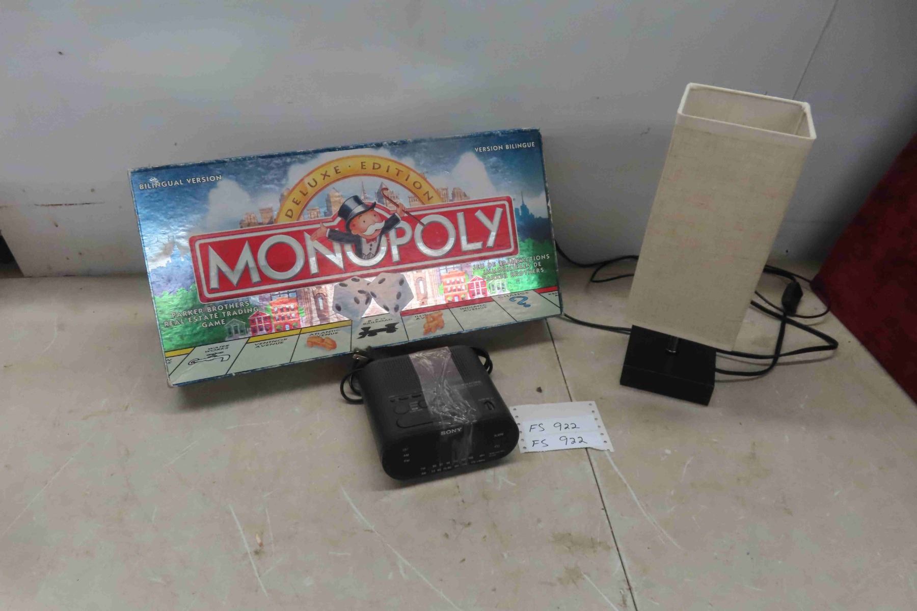 Monopoly Board Game, Clock Radio, Desk Lamp
